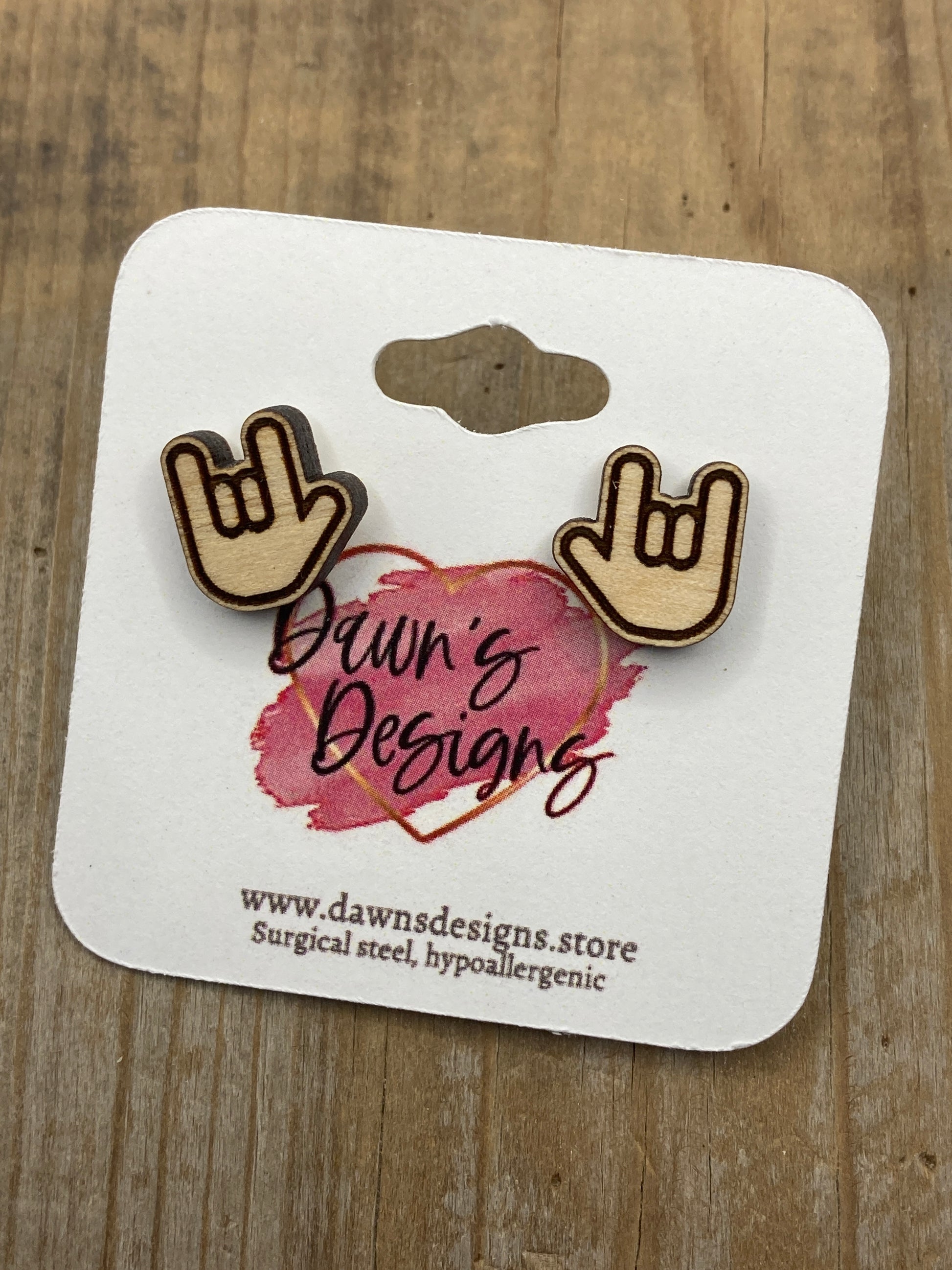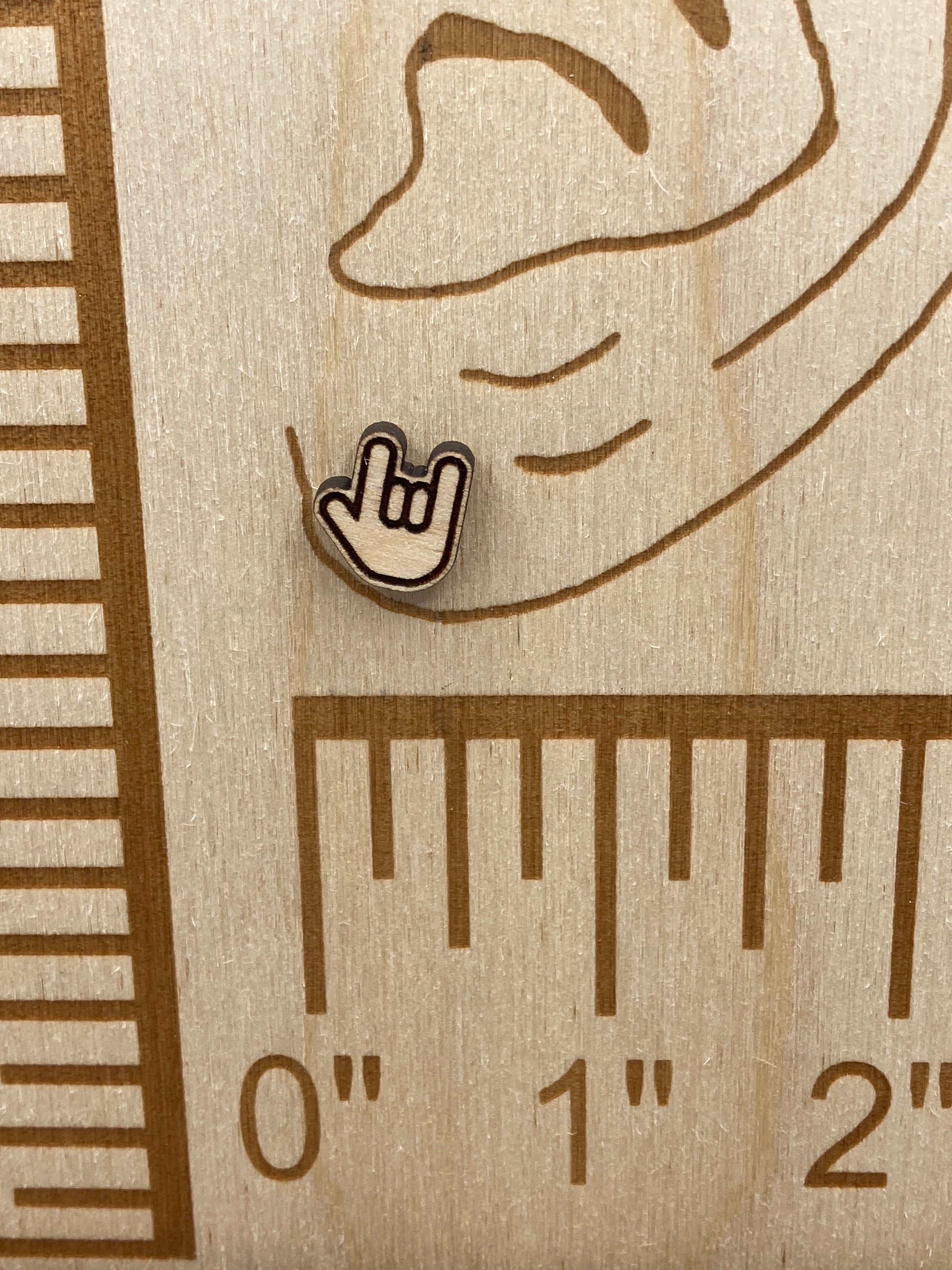 Hand-painted, laser-cut, wooden ASL I love you stud earrings. Approx. ½”