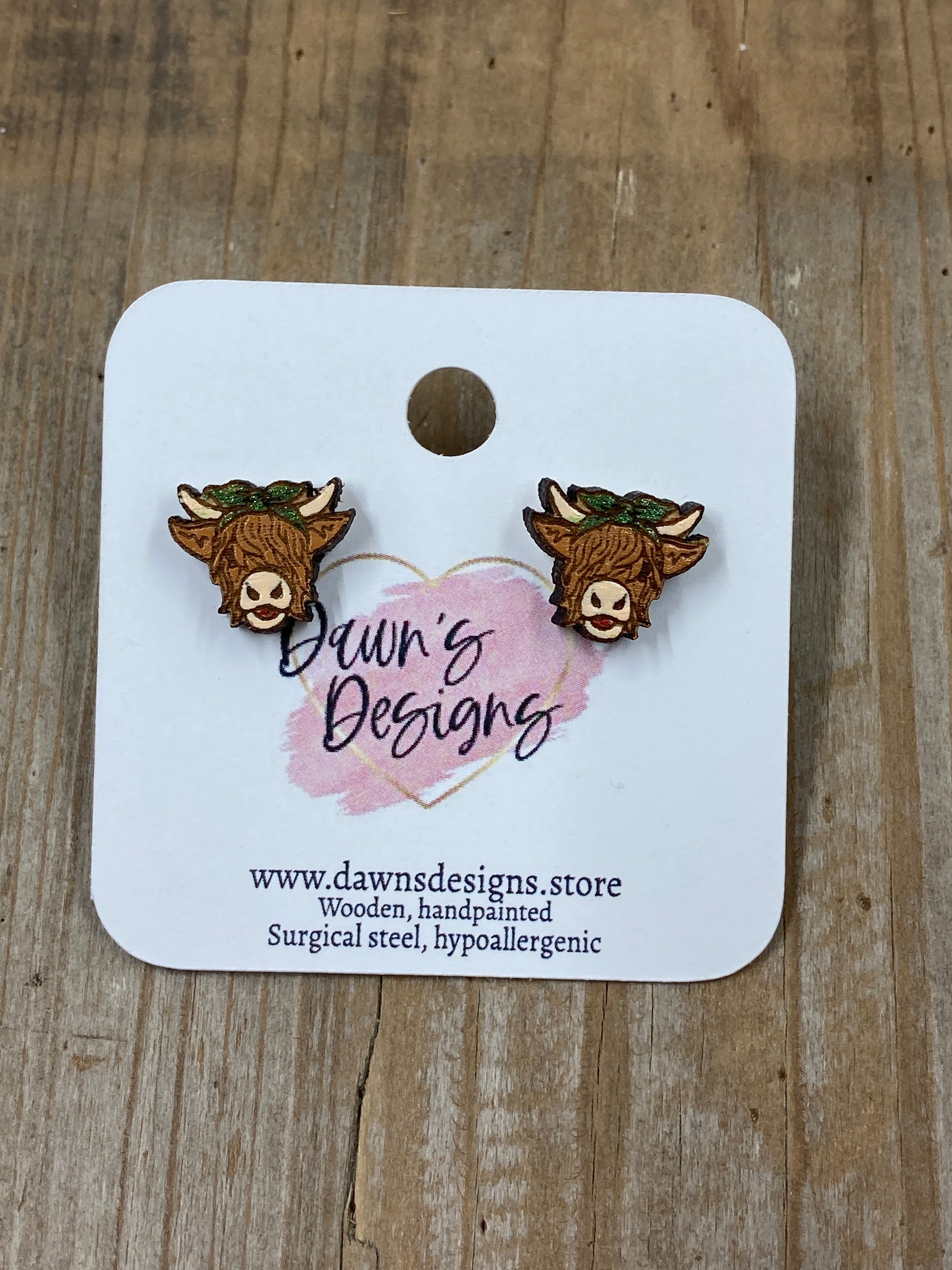 Hand-painted, laser-cut, wooden hyland cow stud earrings. Approx. ½”