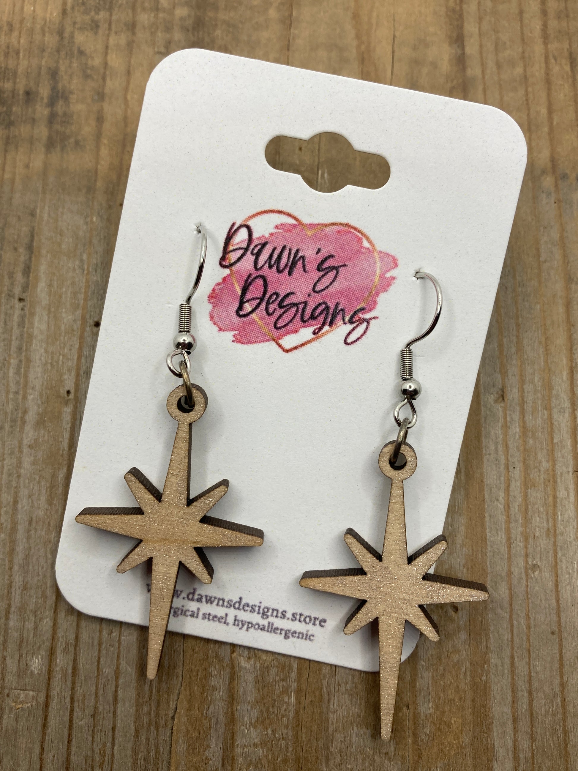 Hand-painted, laser-cut, wooden Bethlehem Star dangle earrings.