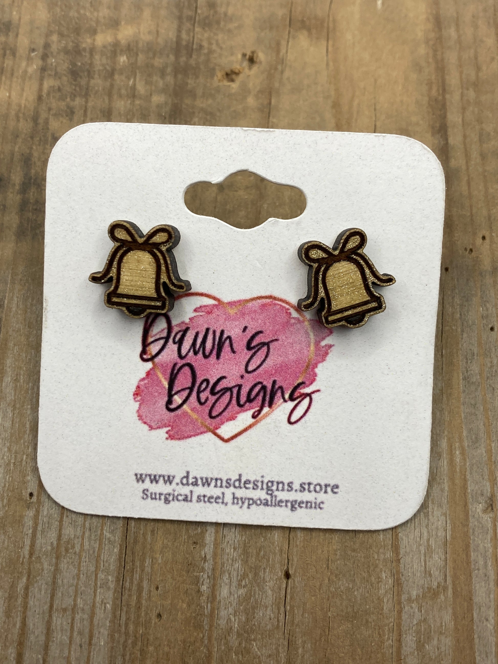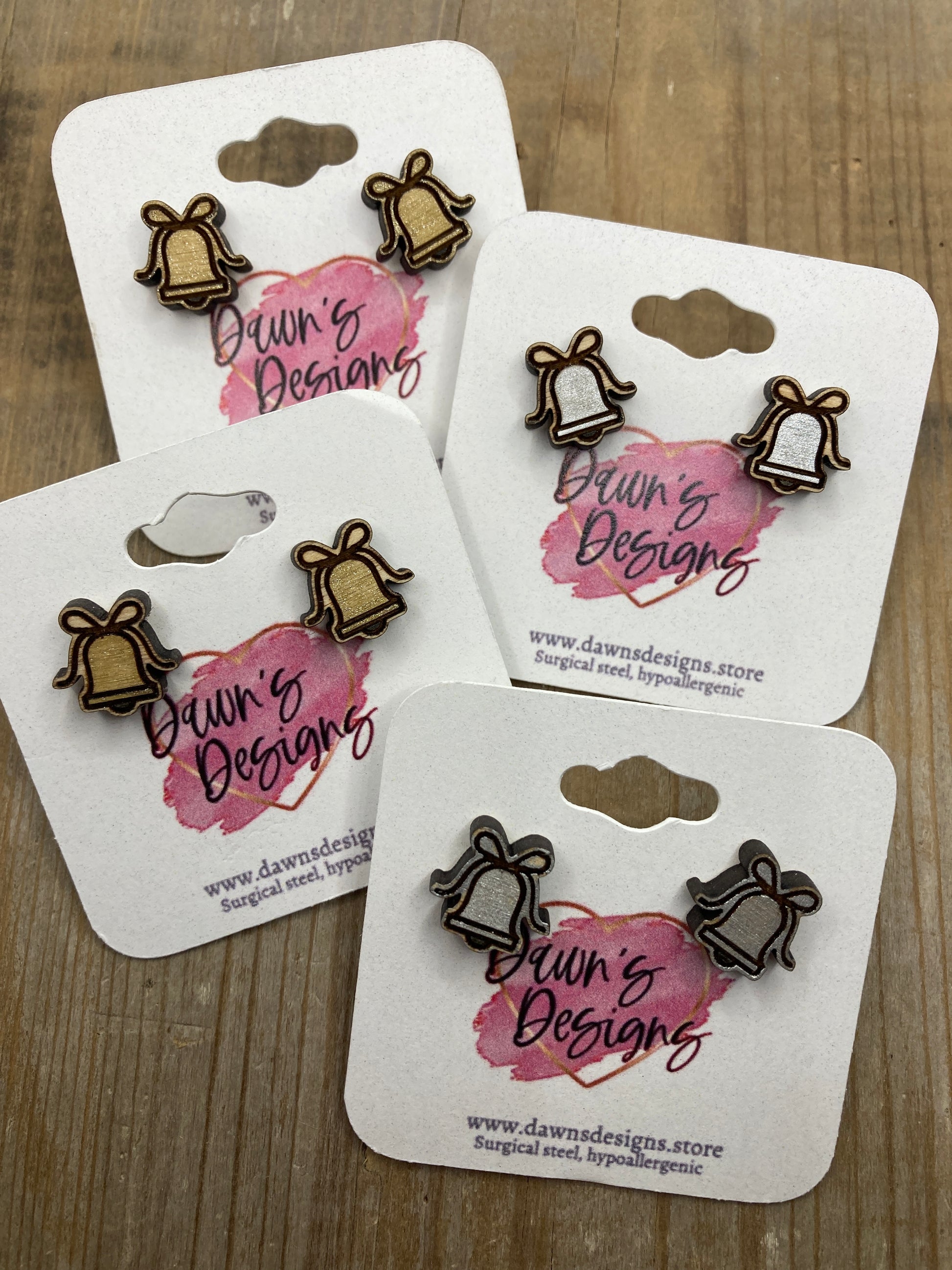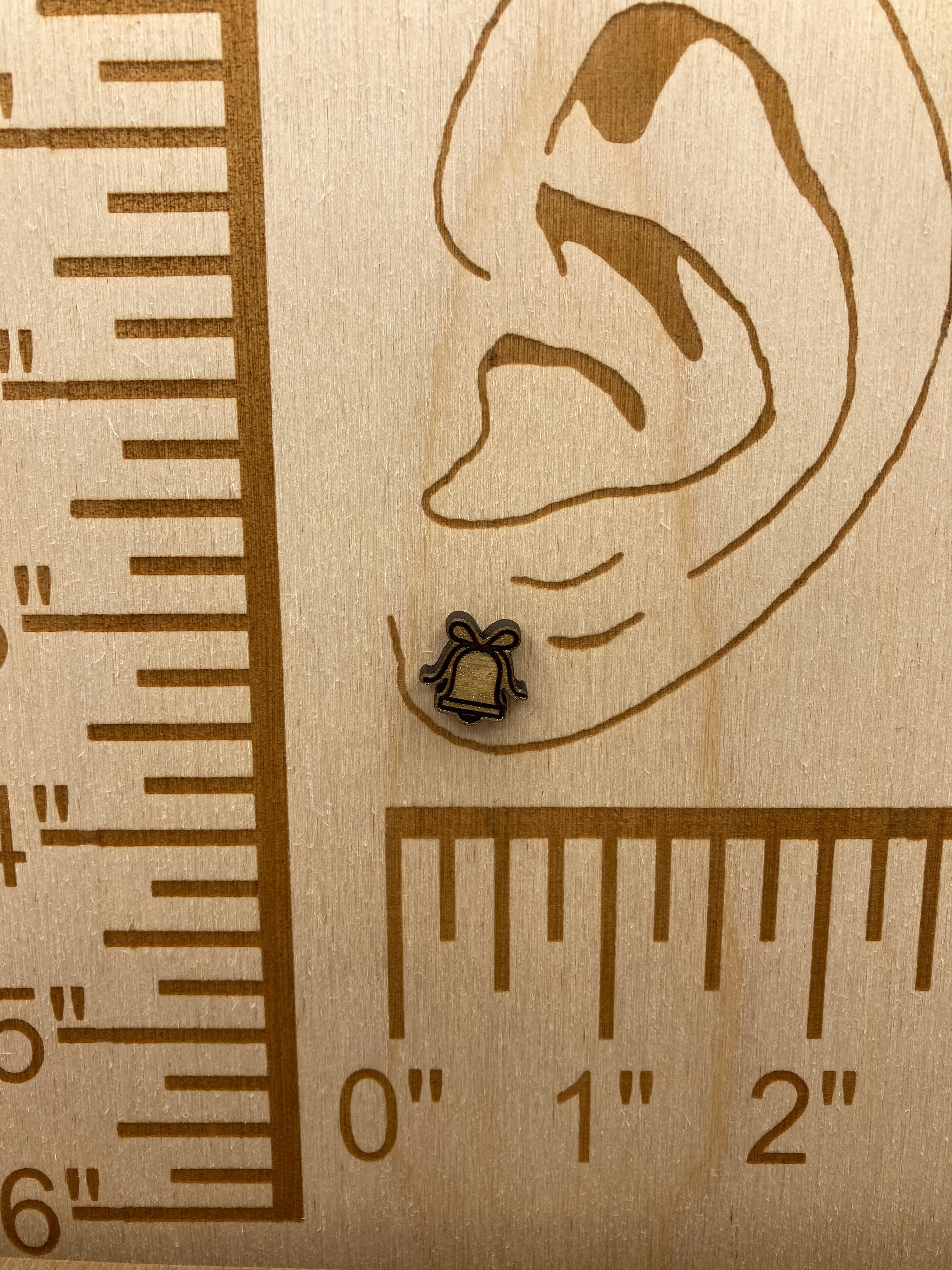 Hand-painted, laser-cut, wooden Christmas Bell stud earrings. Approx. ½”