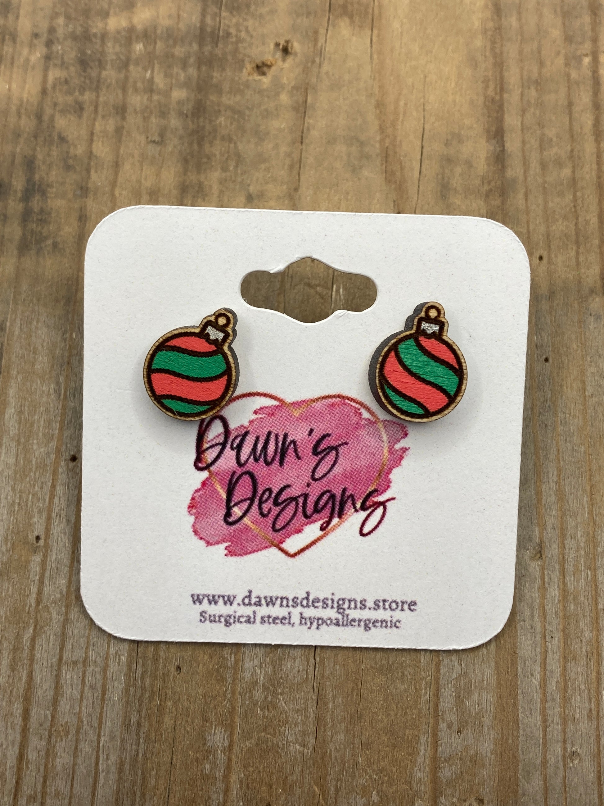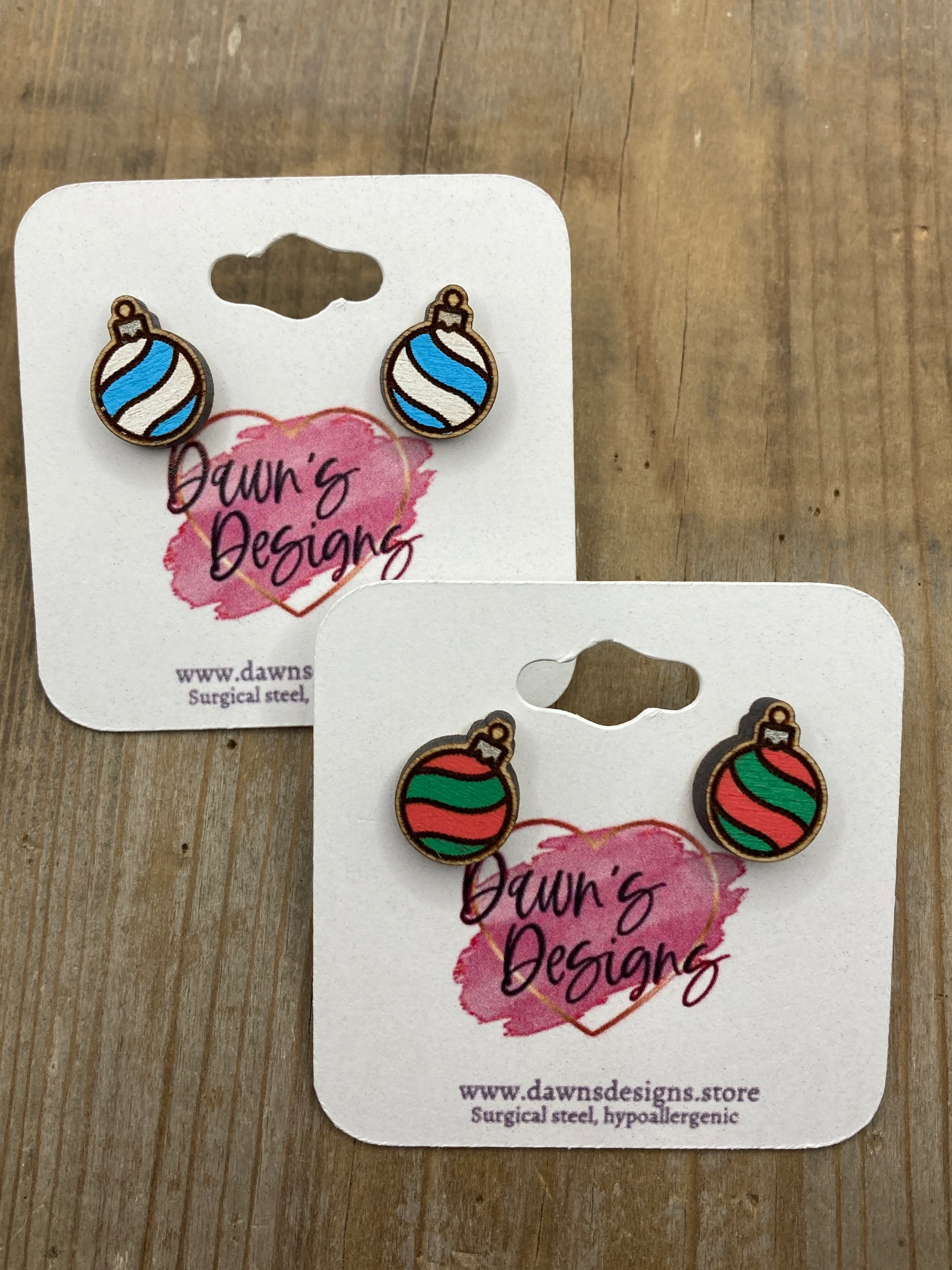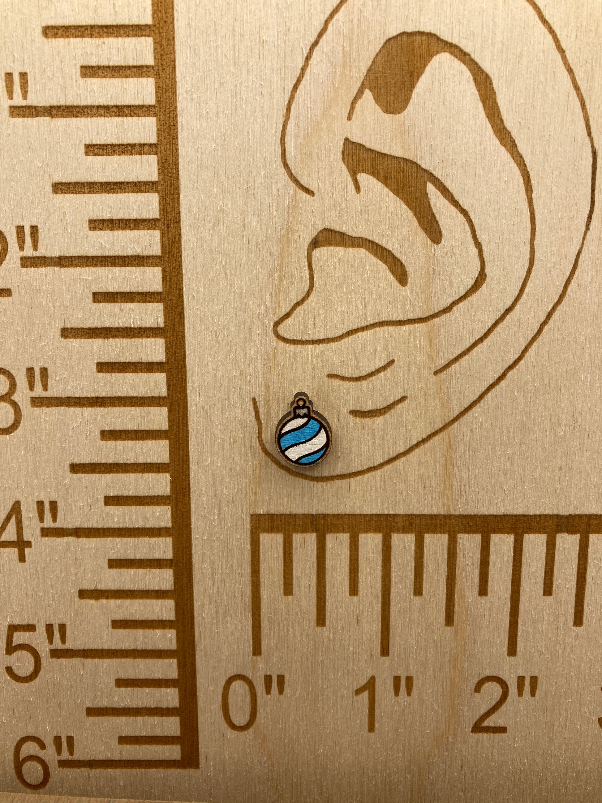 Hand-painted, laser-cut, wooden Christmas ornament stud earrings. Approx. ½”