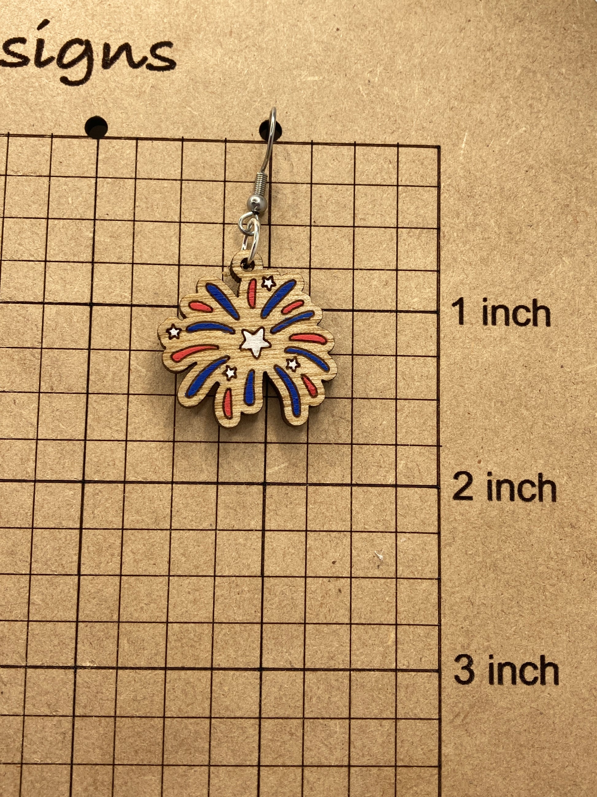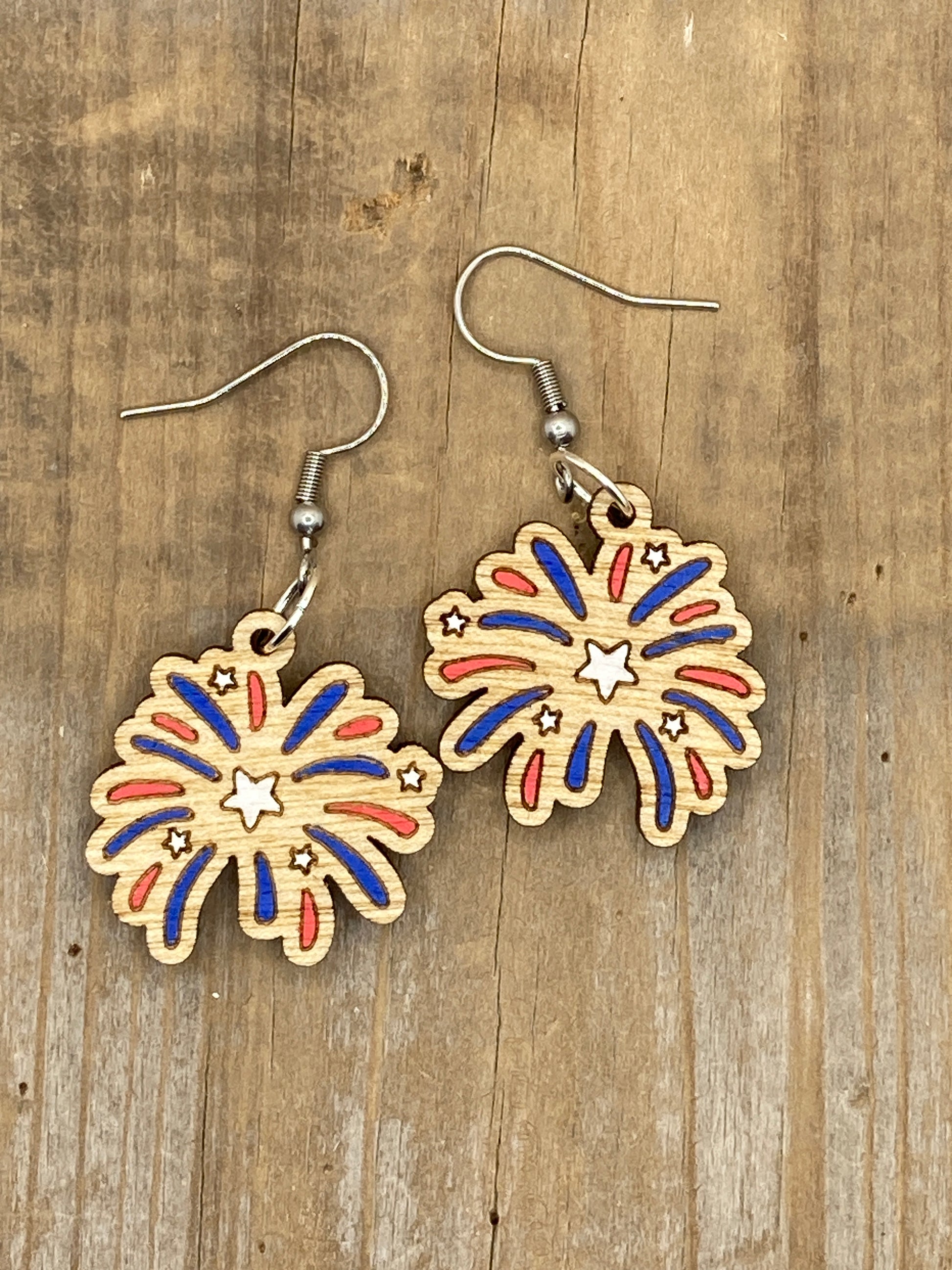 Hand-painted, laser-cut, wooden Fireworks dangle earrings.