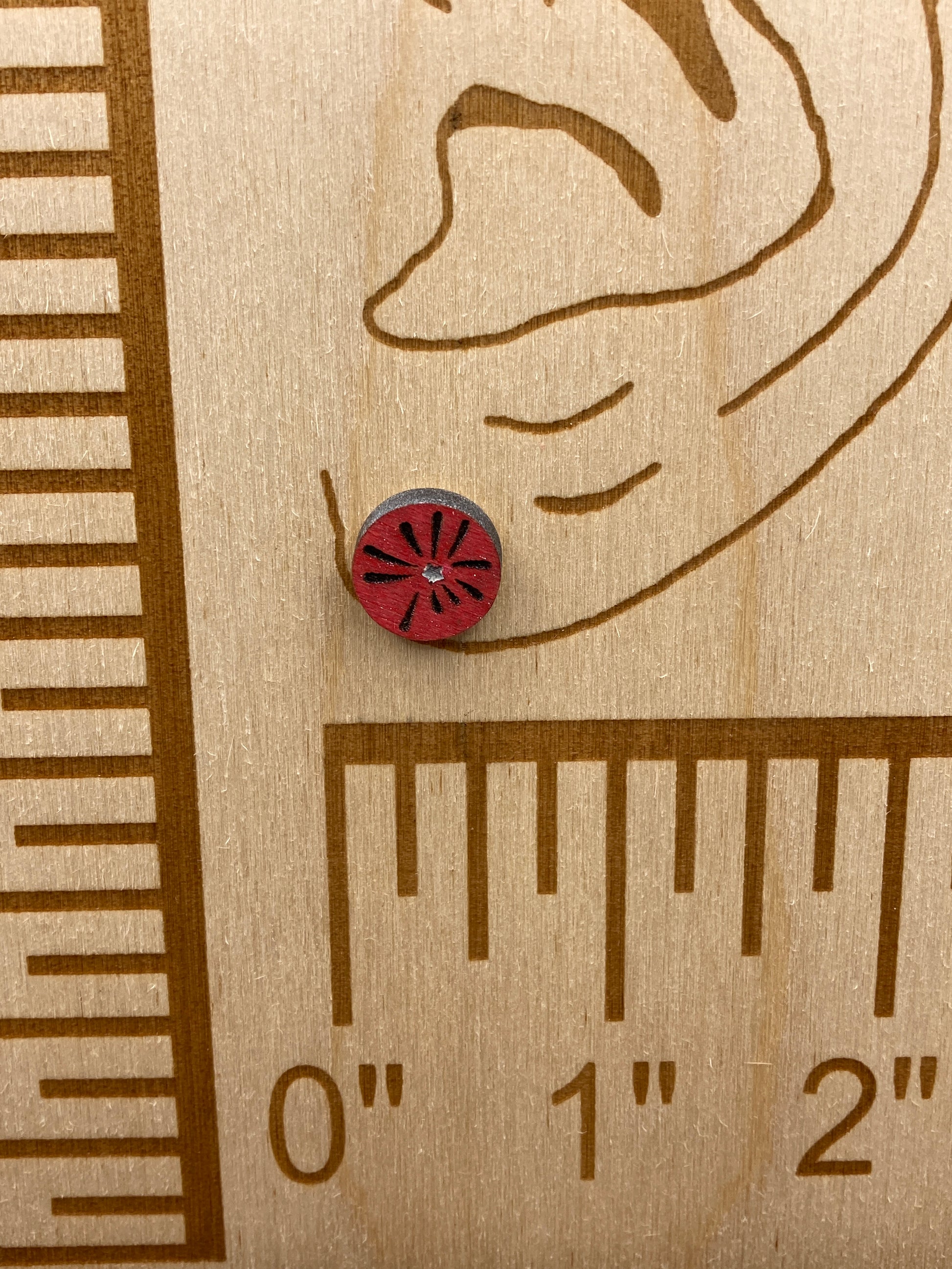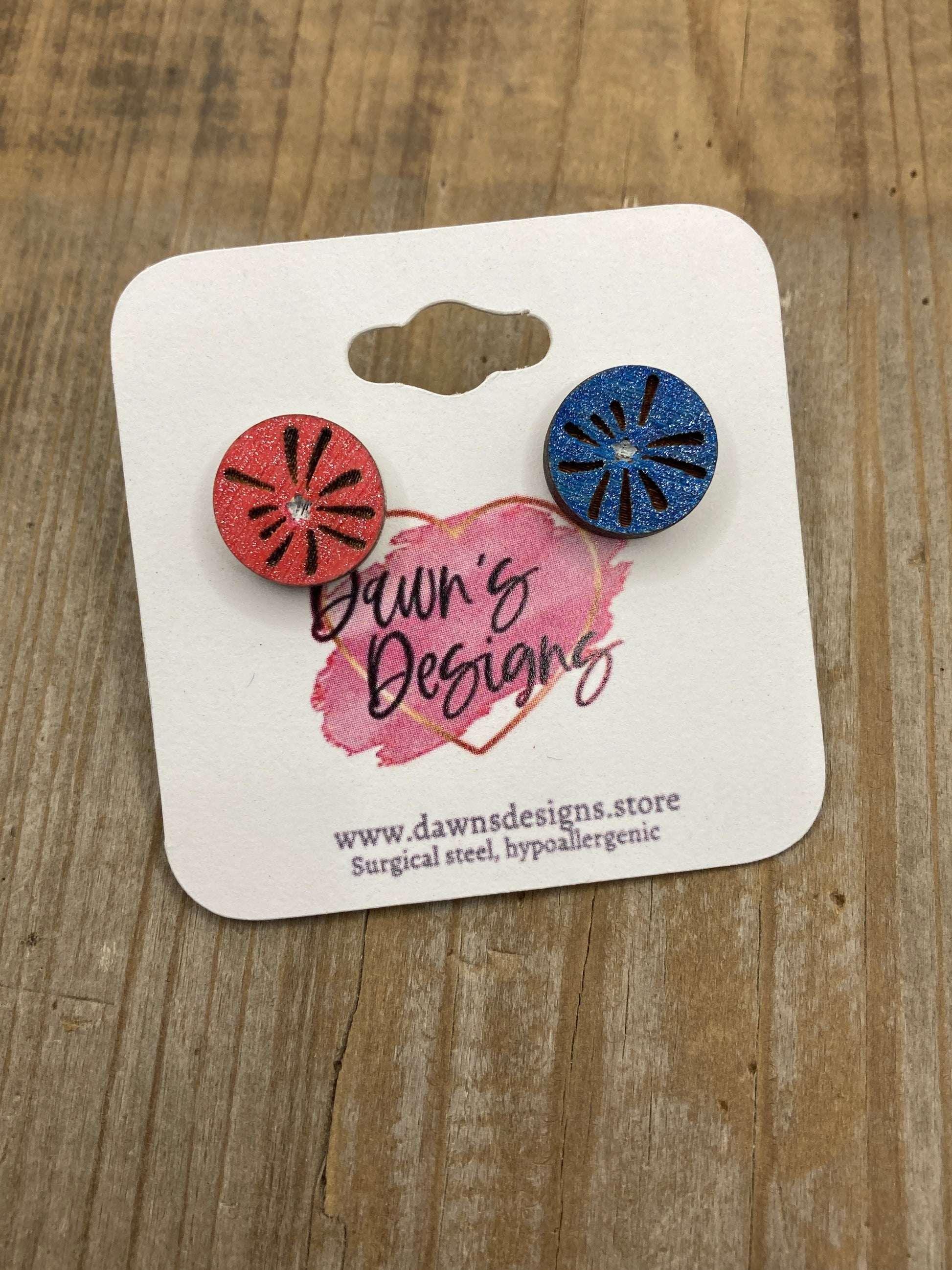 Hand-painted, laser-cut, wooden Fireworks stud earrings. Approx. ½”