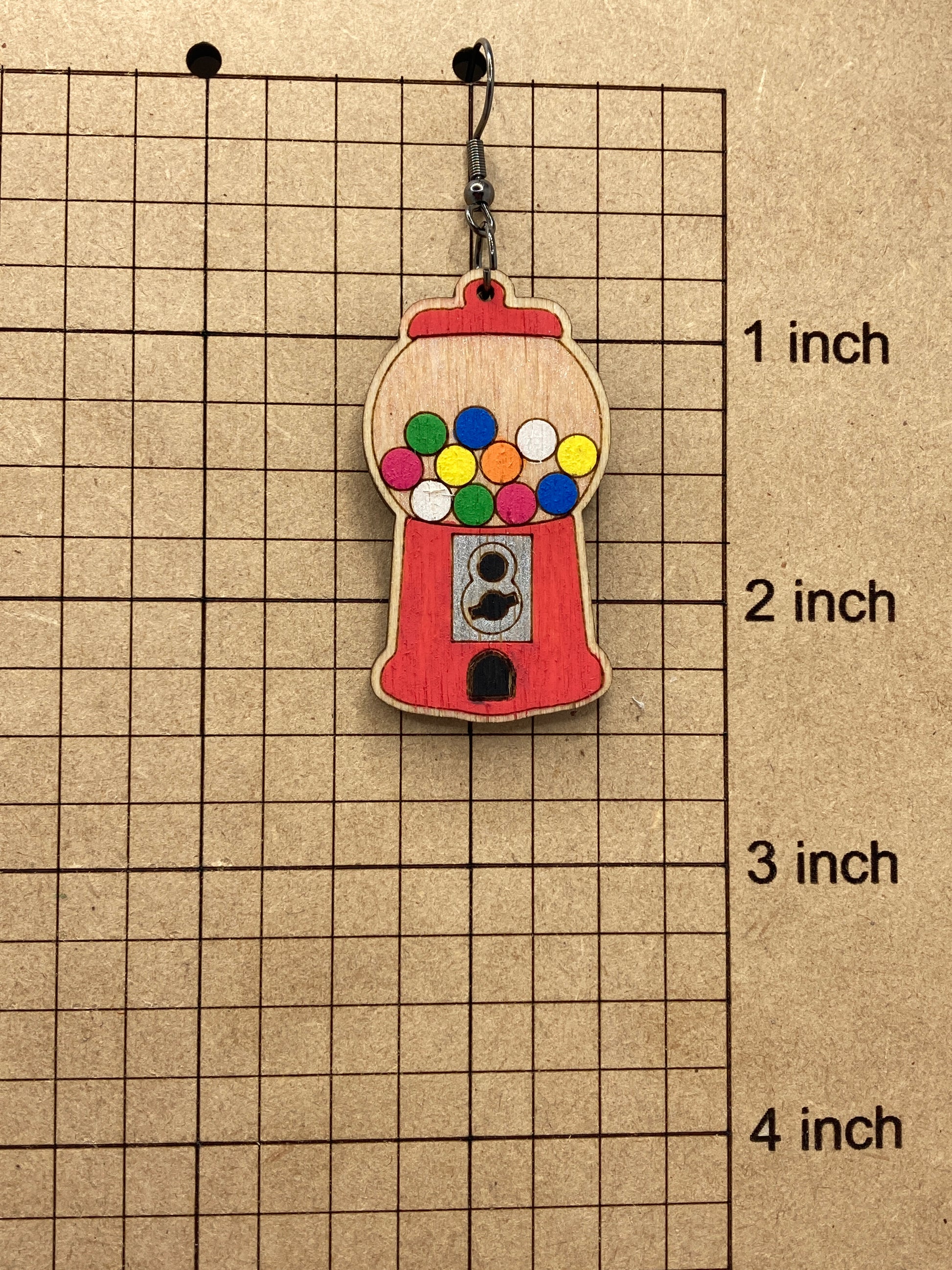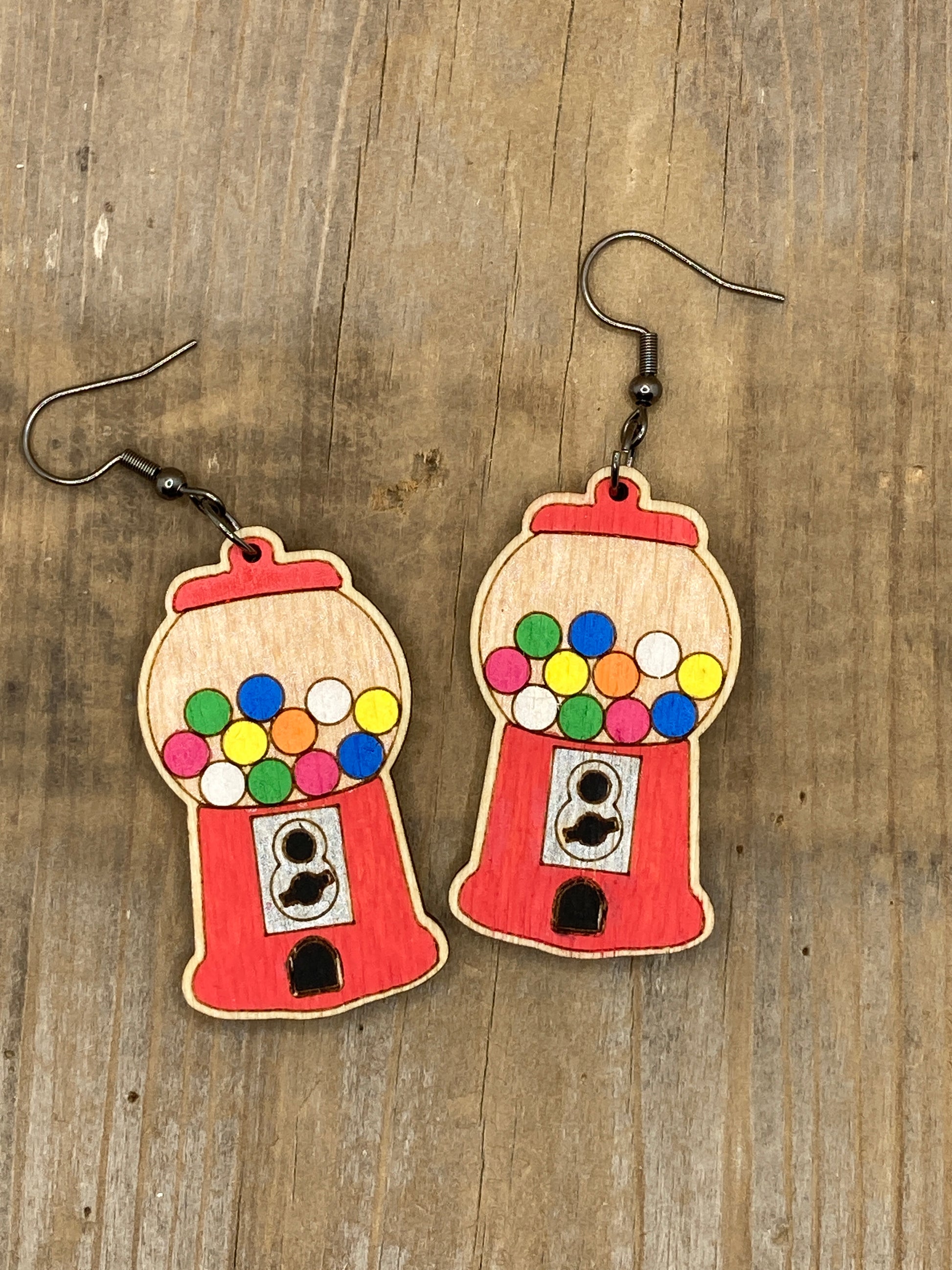 Hand-painted, laser-cut, wooden gumball machine dangle earrings.