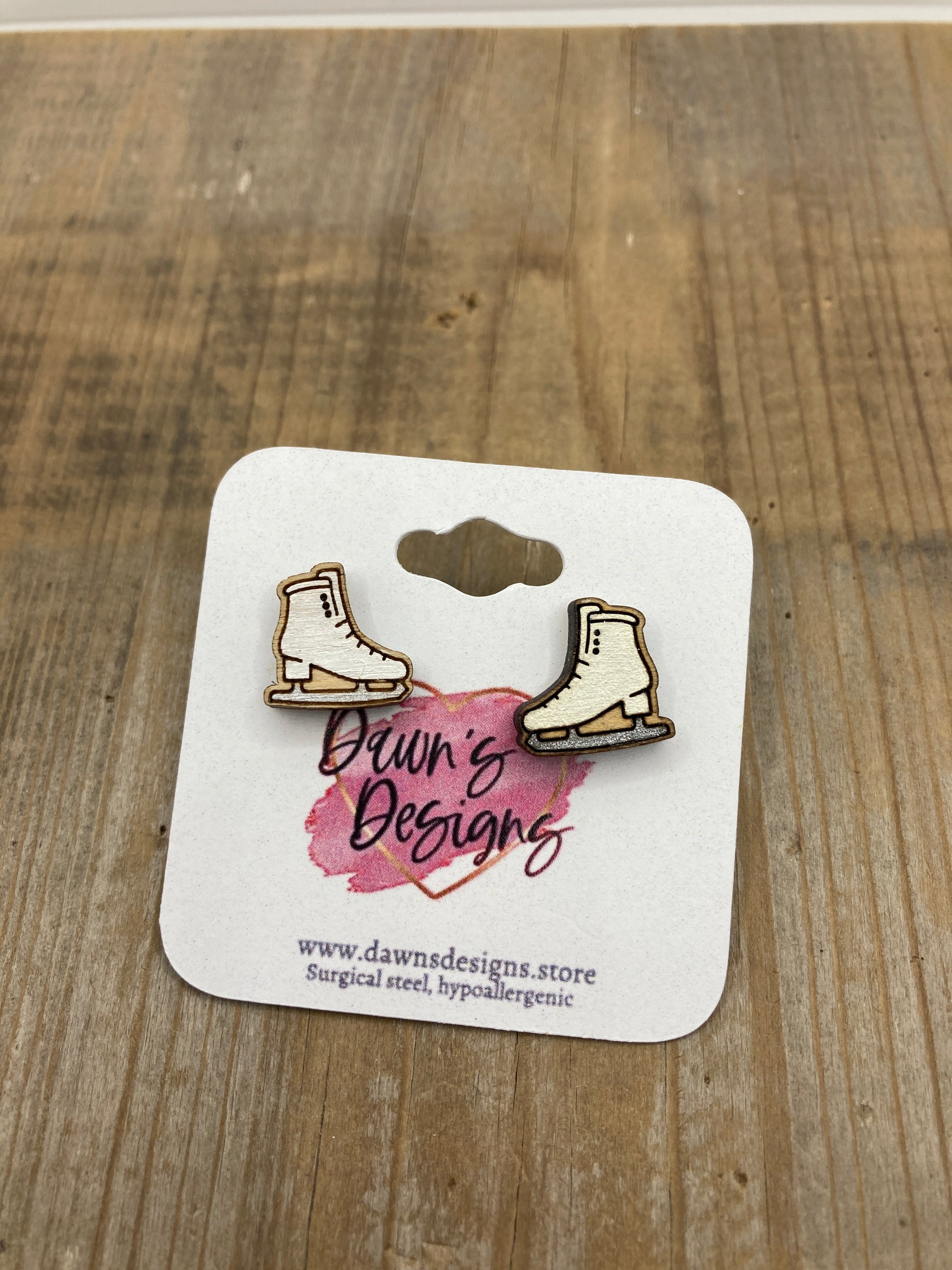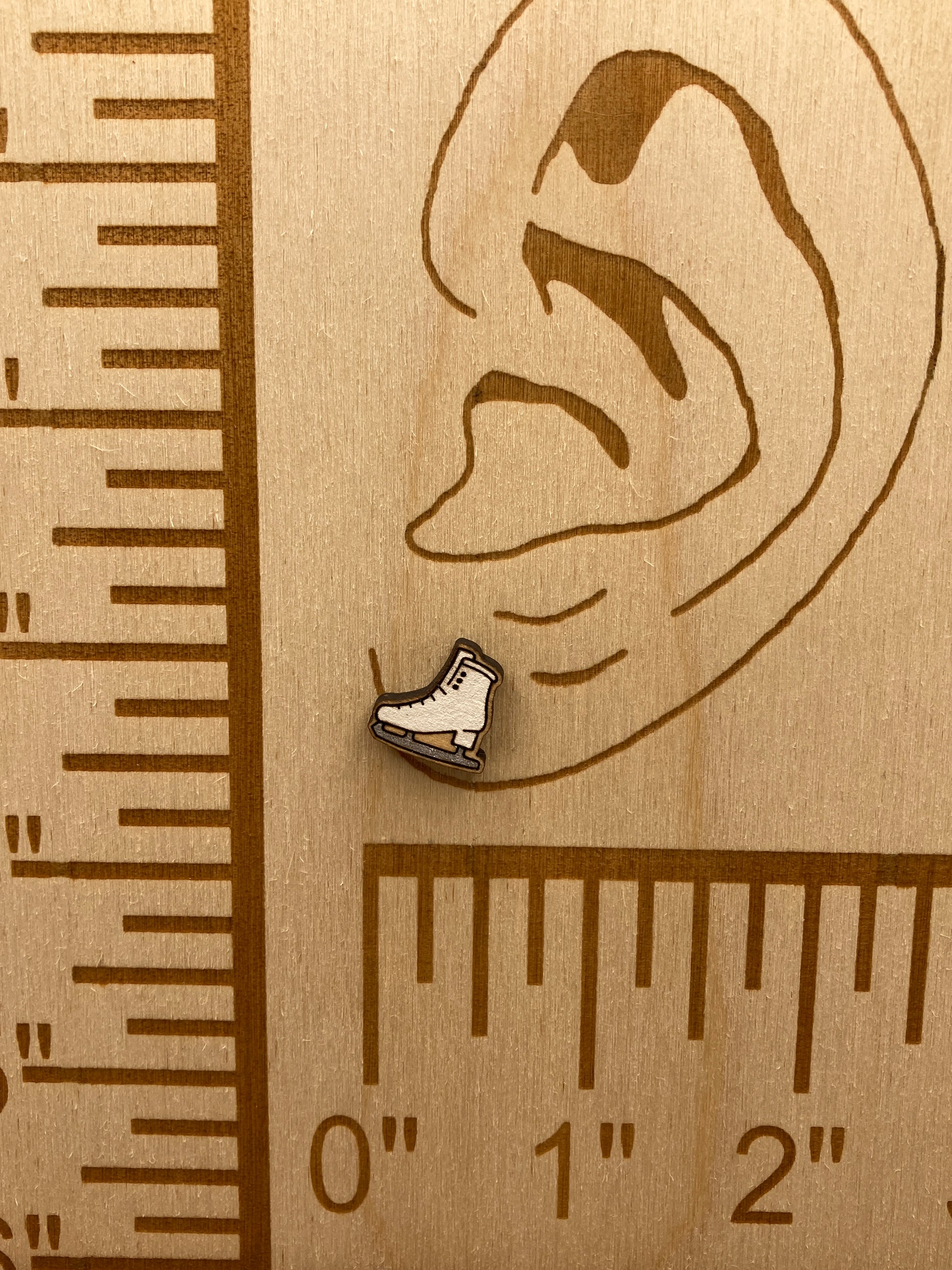 Hand-painted, laser-cut, wooden Ice Skates stud earrings. Approx. ½”