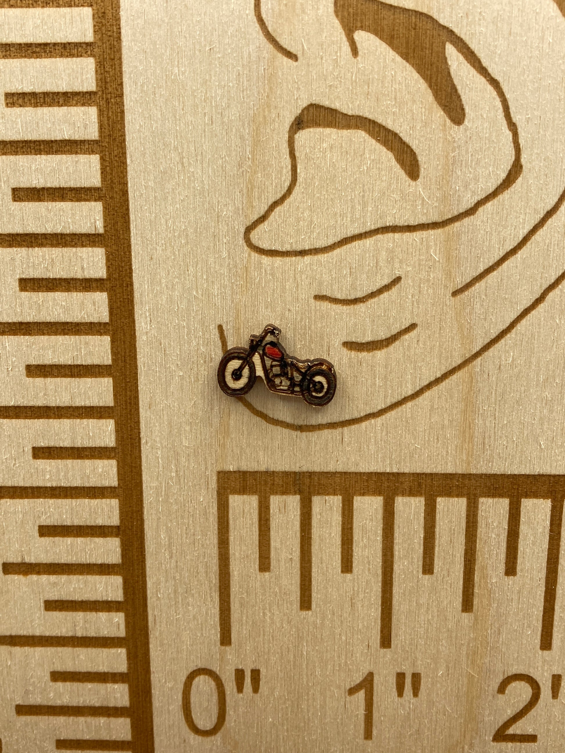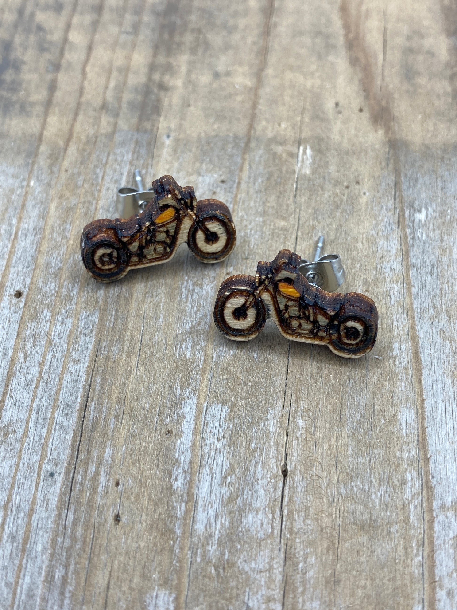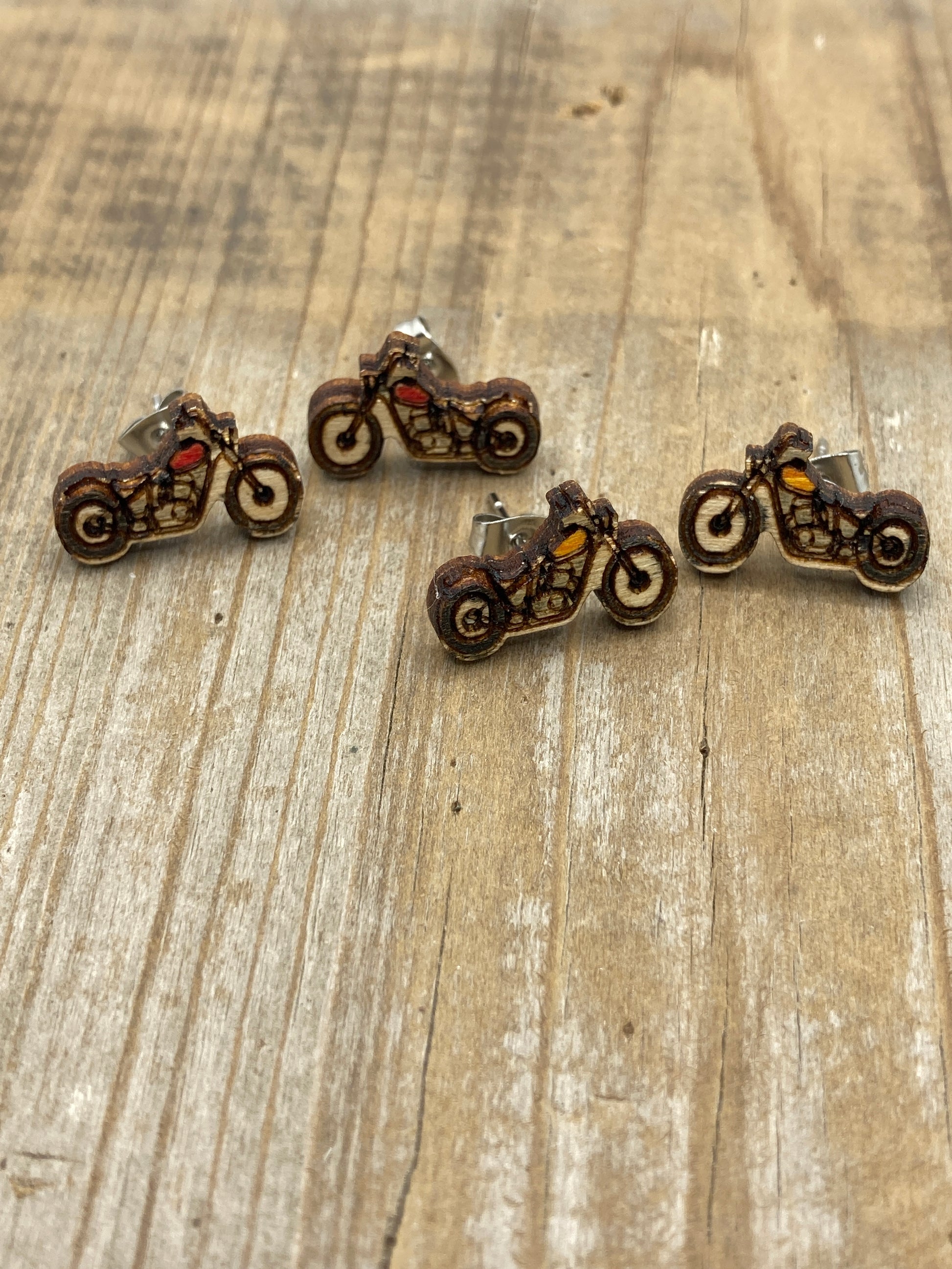 Hand-painted, laser-cut, wooden Motorcycle stud earrings. Approx. ½”