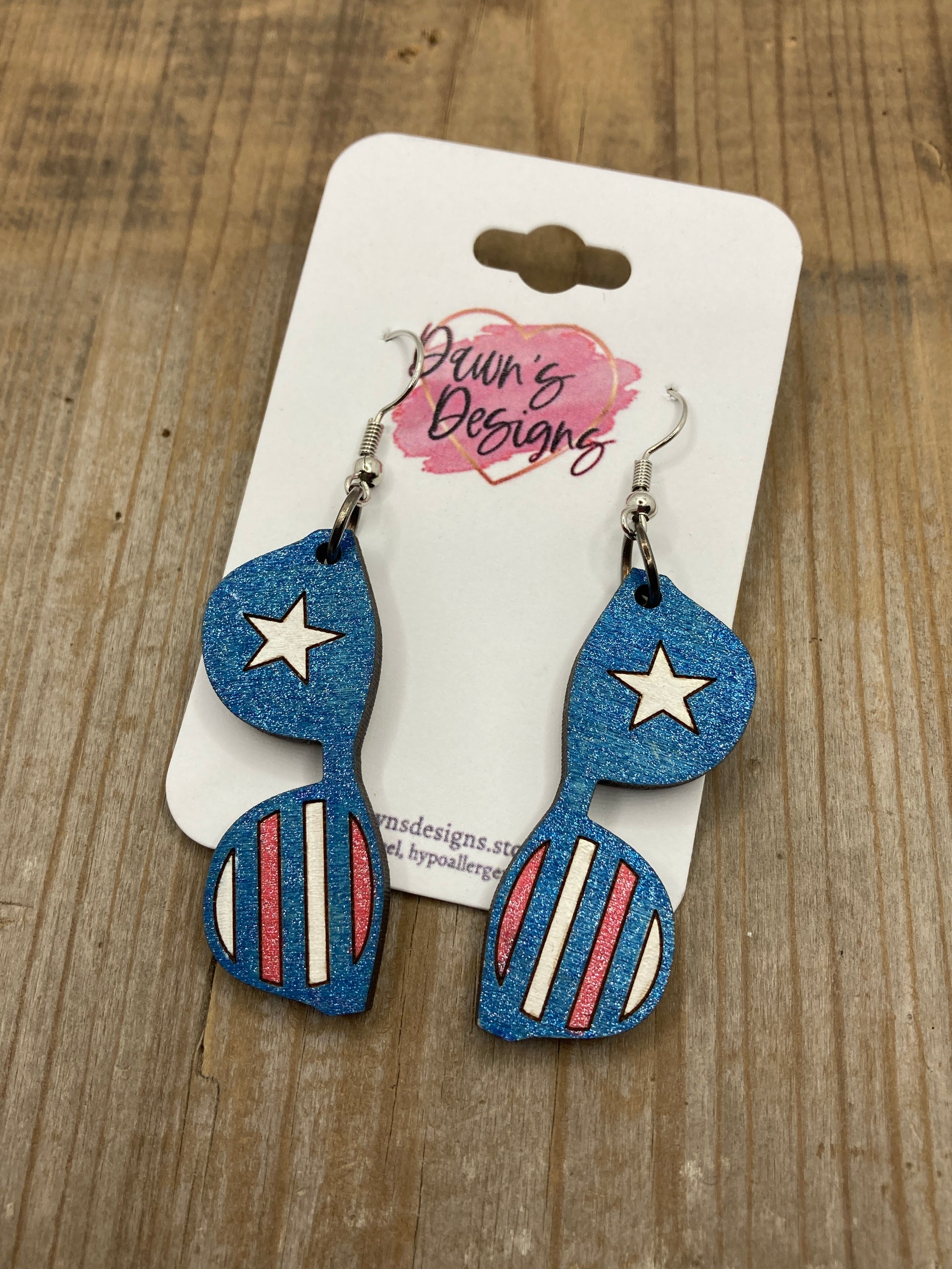 Hand-painted, laser-cut, wooden Patriotic Sunglasses dangle earrings.