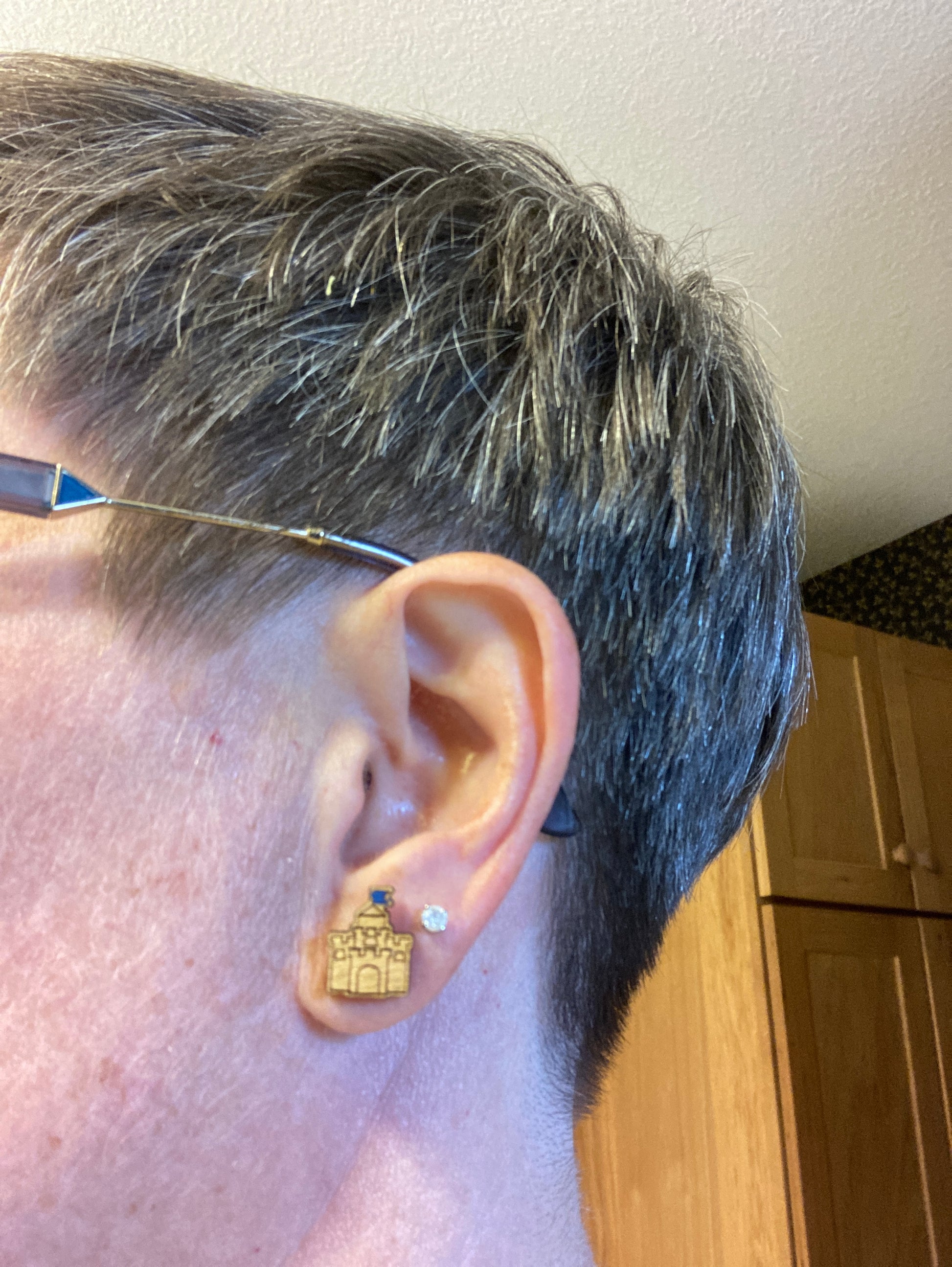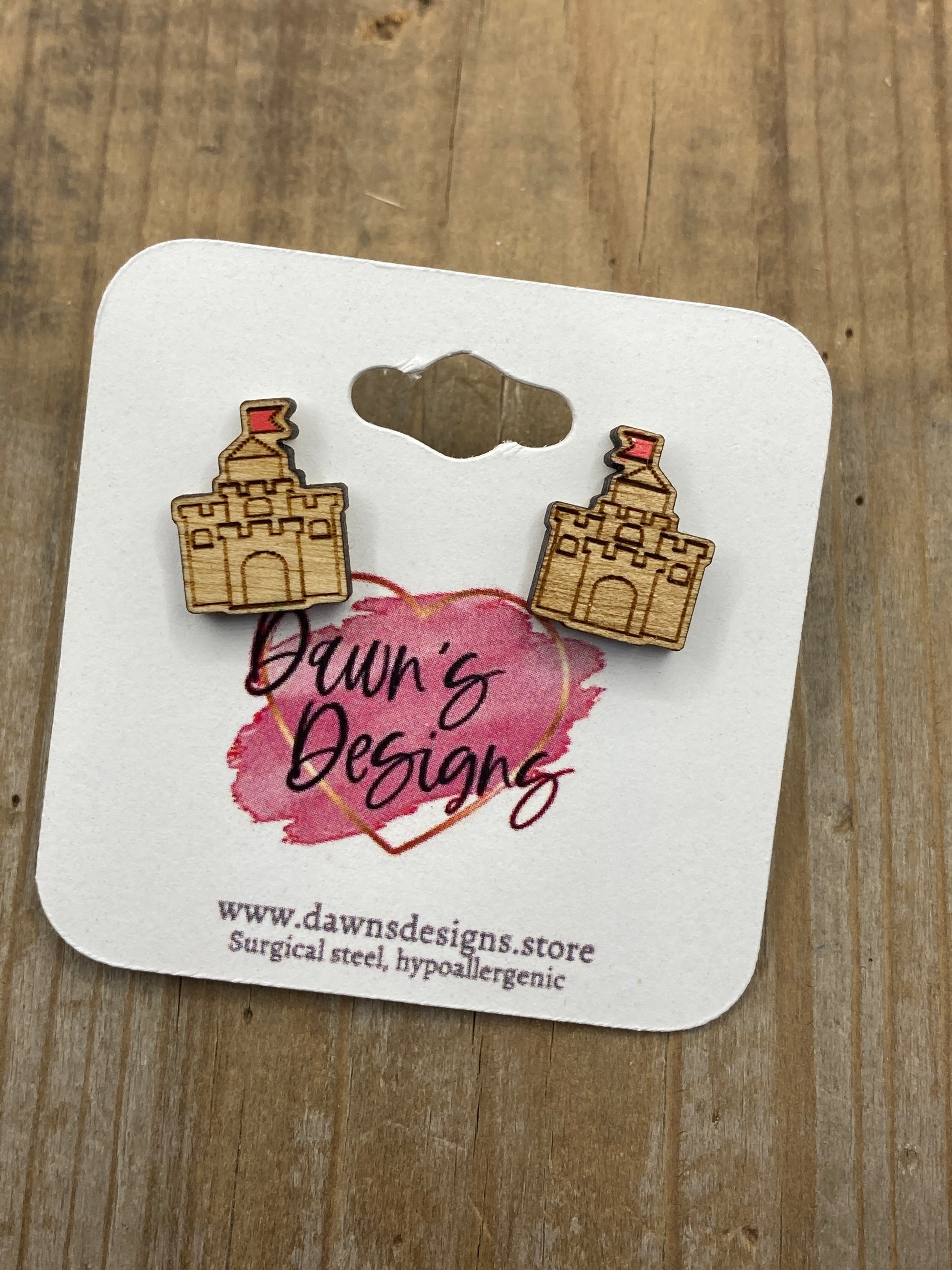 Hand-painted, laser-cut, wooden sandcastle stud earrings. Approx. ½”
