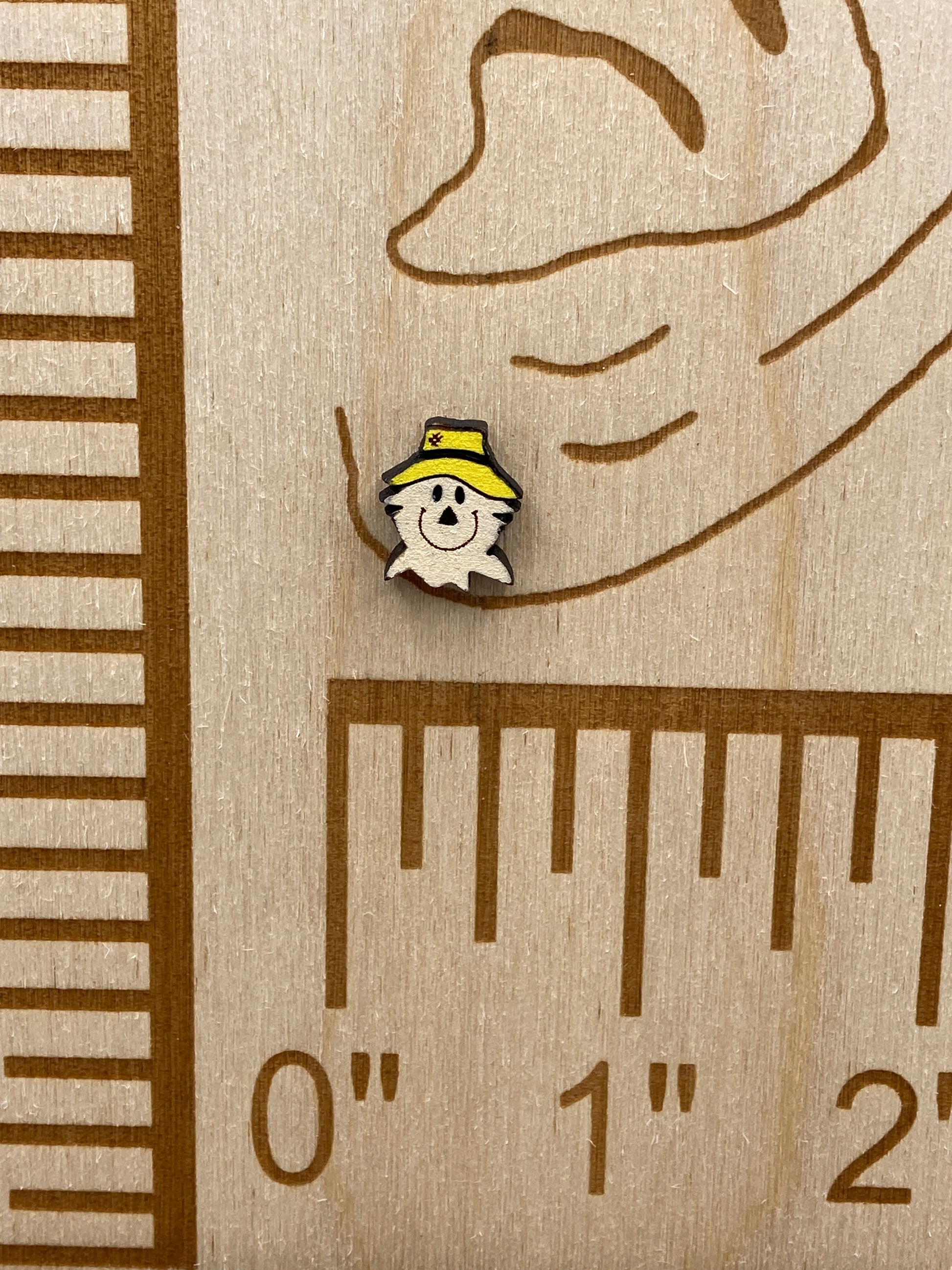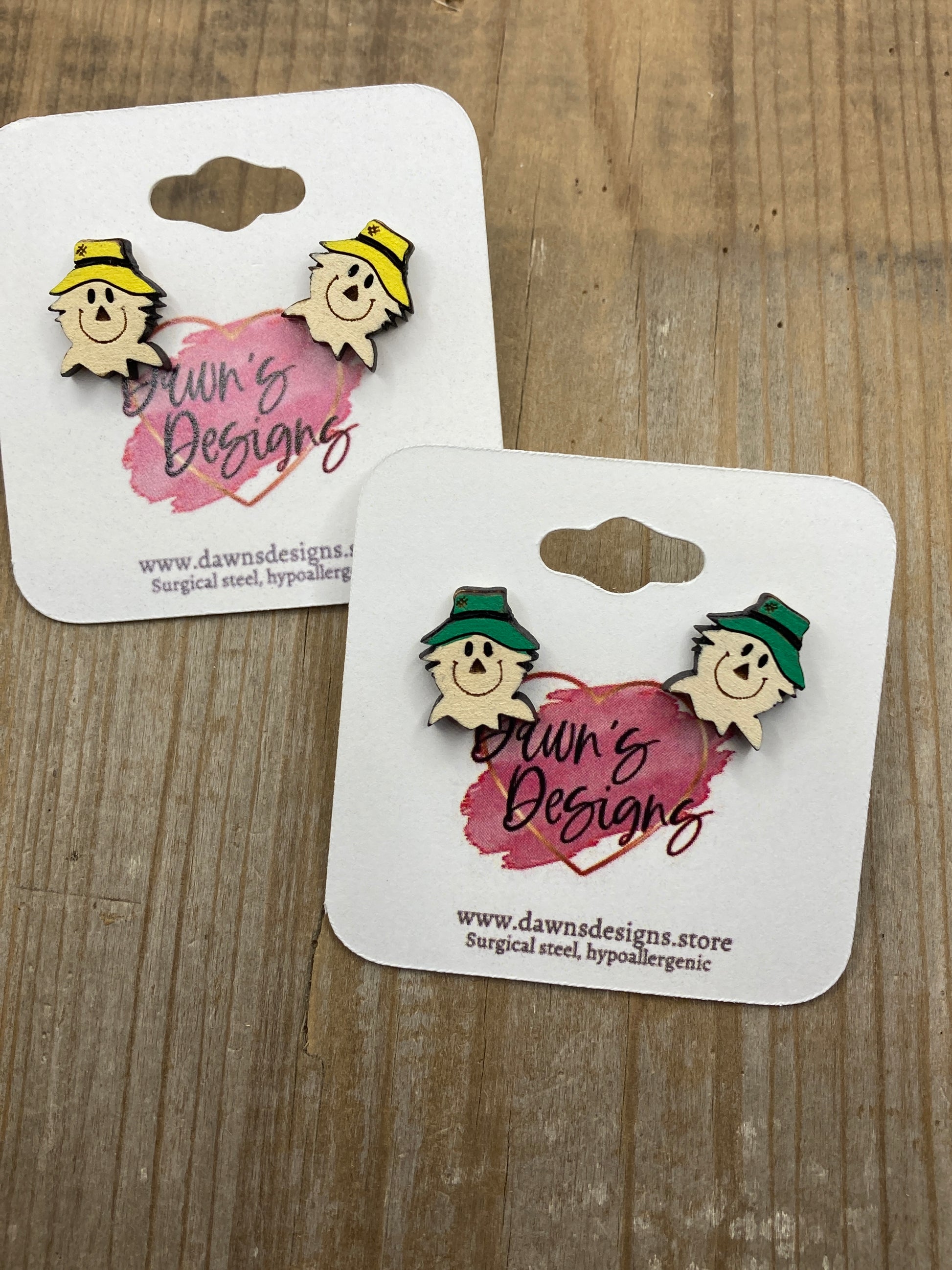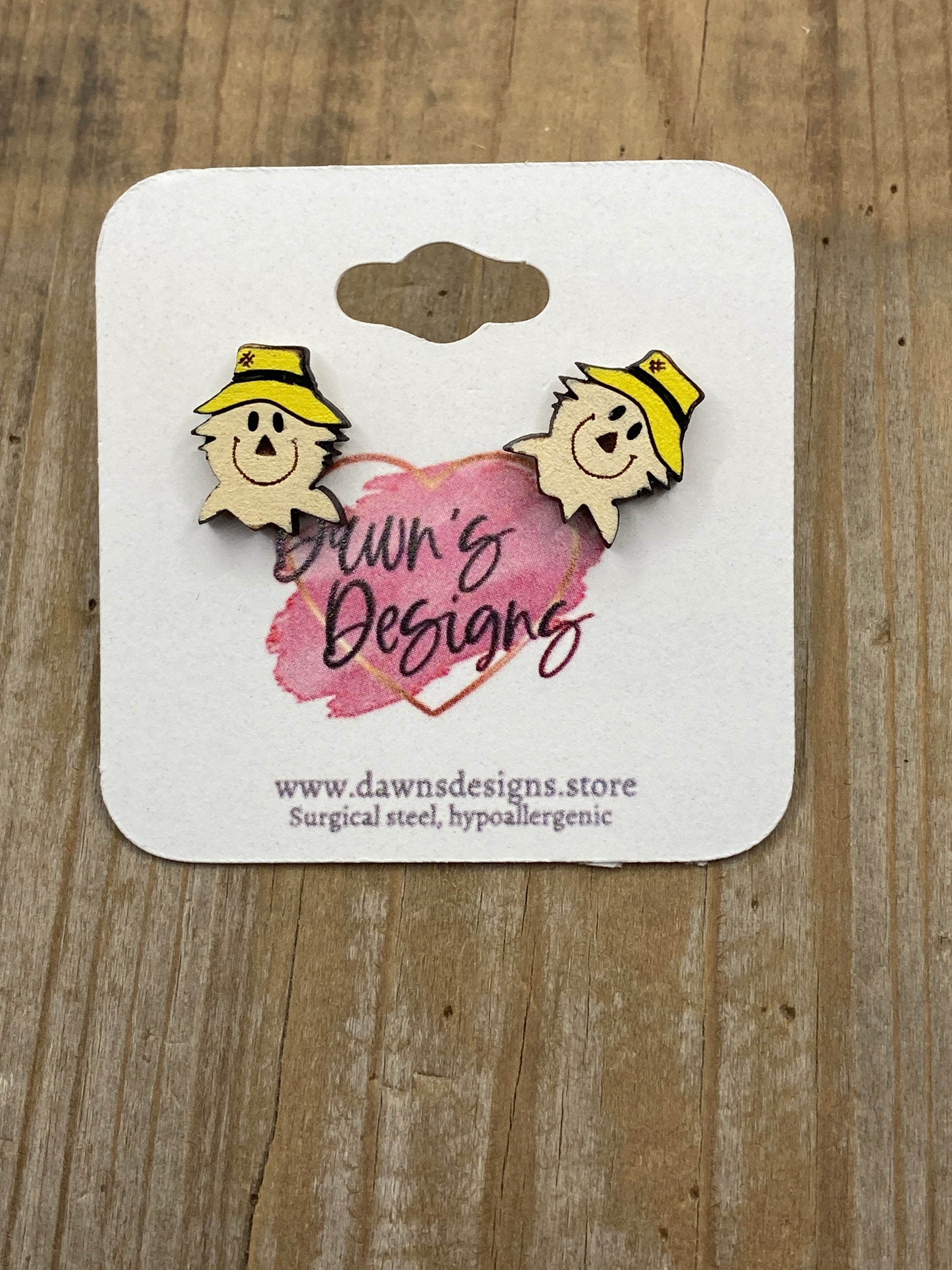Hand-painted, laser-cut, wooden Scarecrow Head stud earrings. Approx. ½”