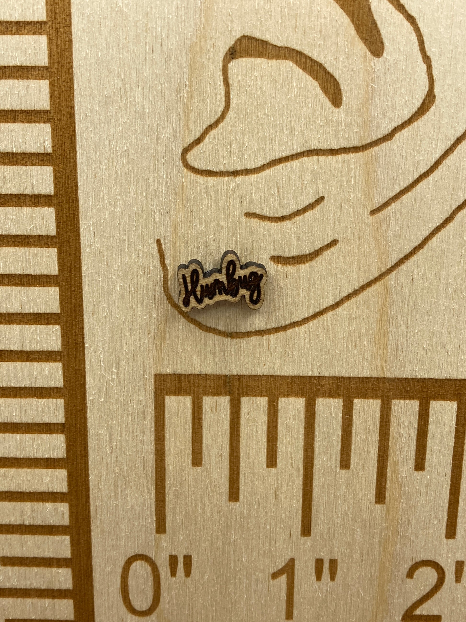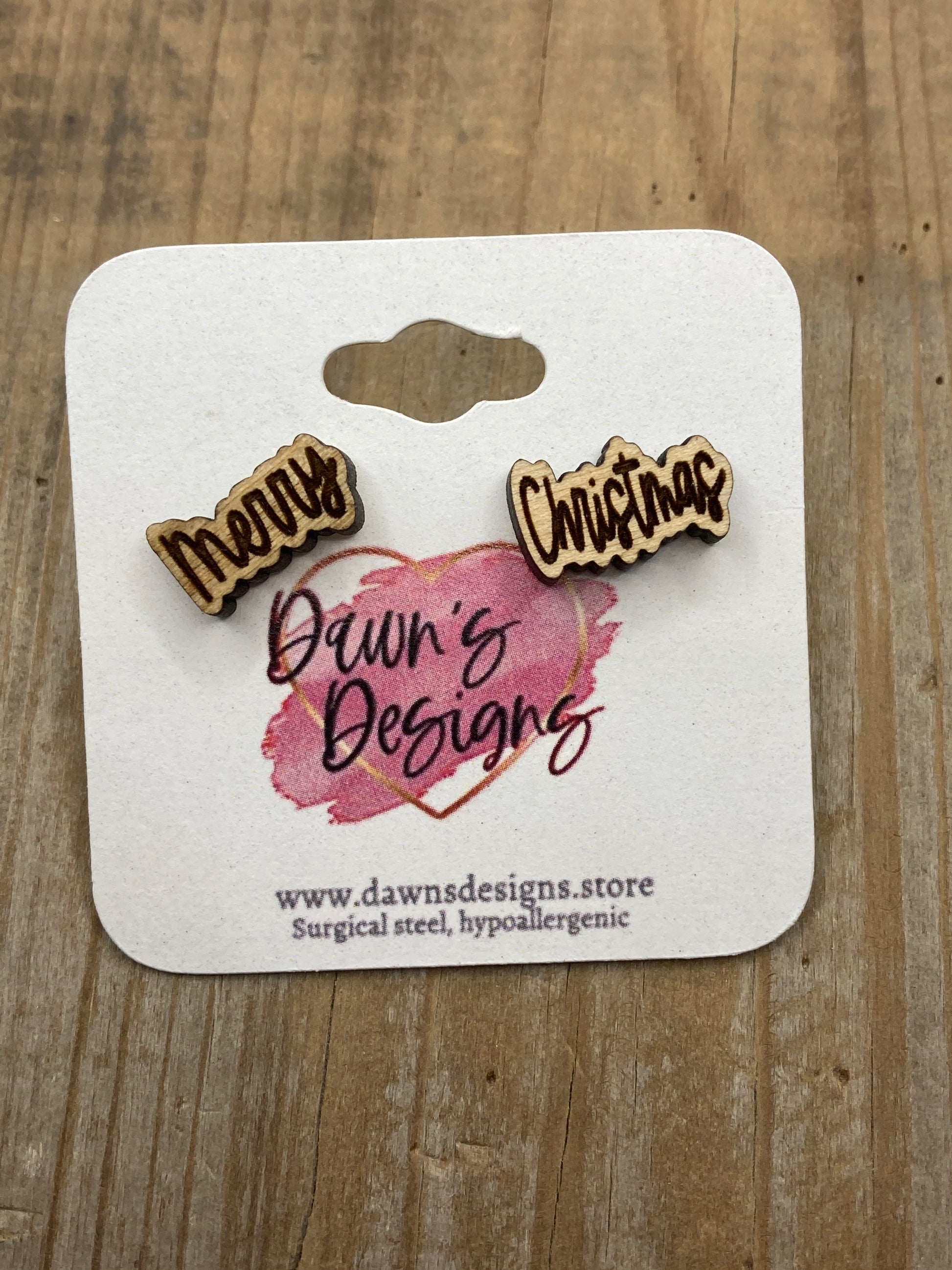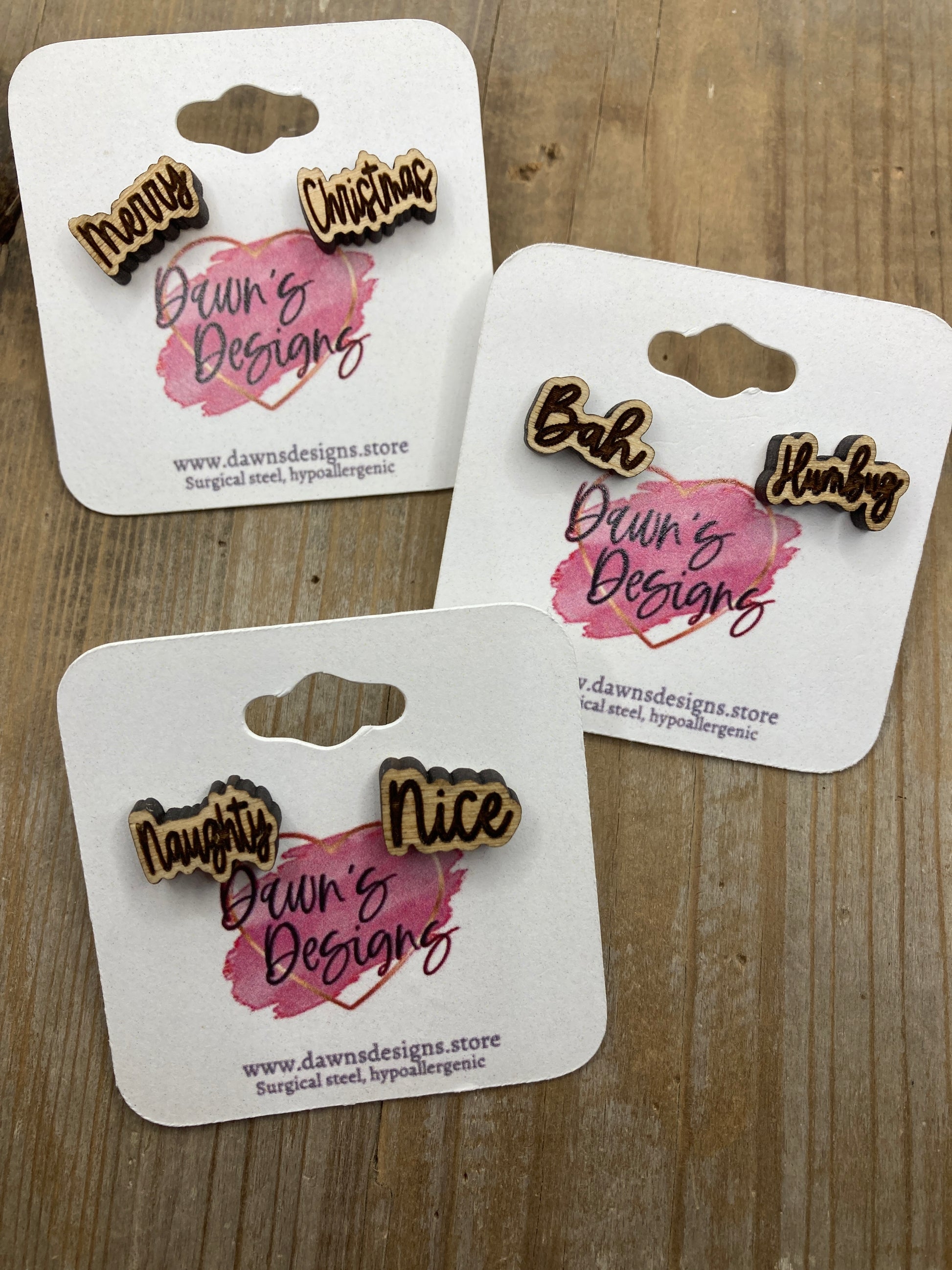 Hand-painted, laser-cut, wooden Script Christmas stud earrings. Approx. ½”