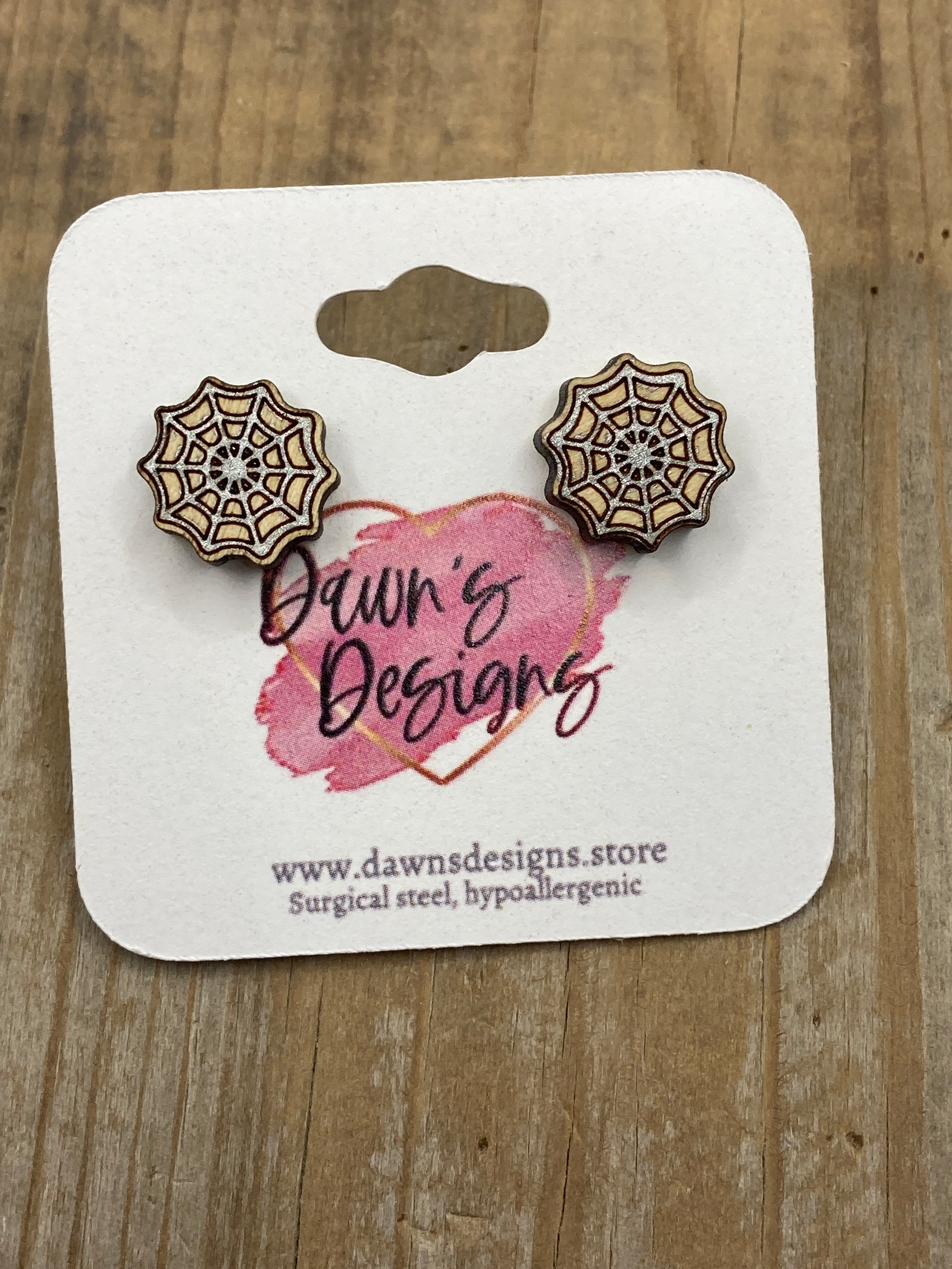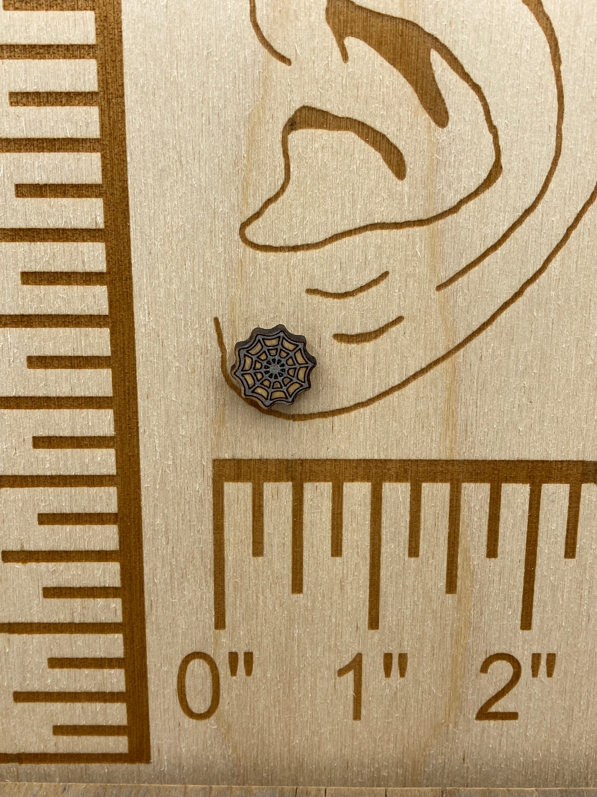 Hand-painted, laser-cut, wooden spider web stud earrings. Approx. ½”
