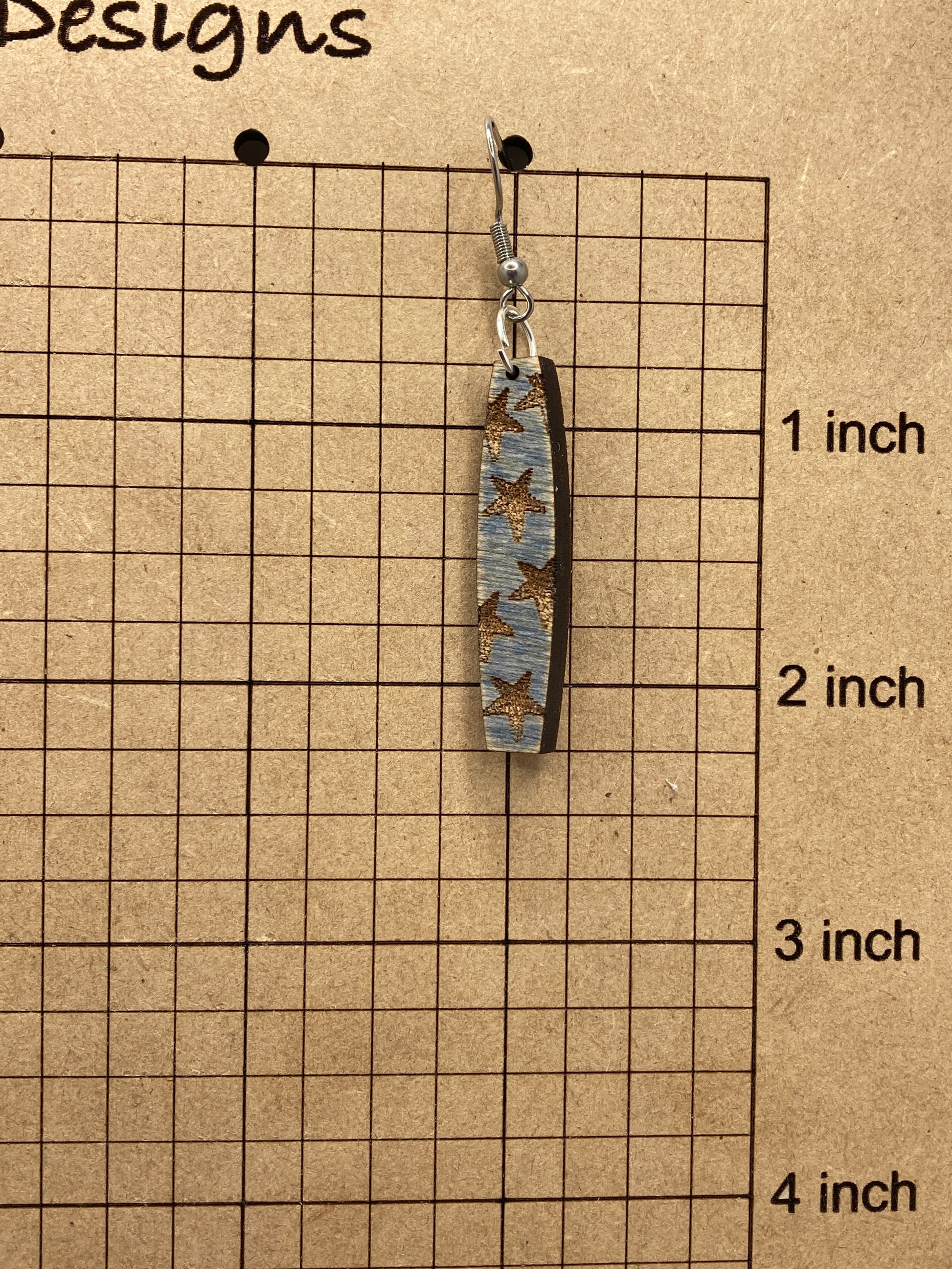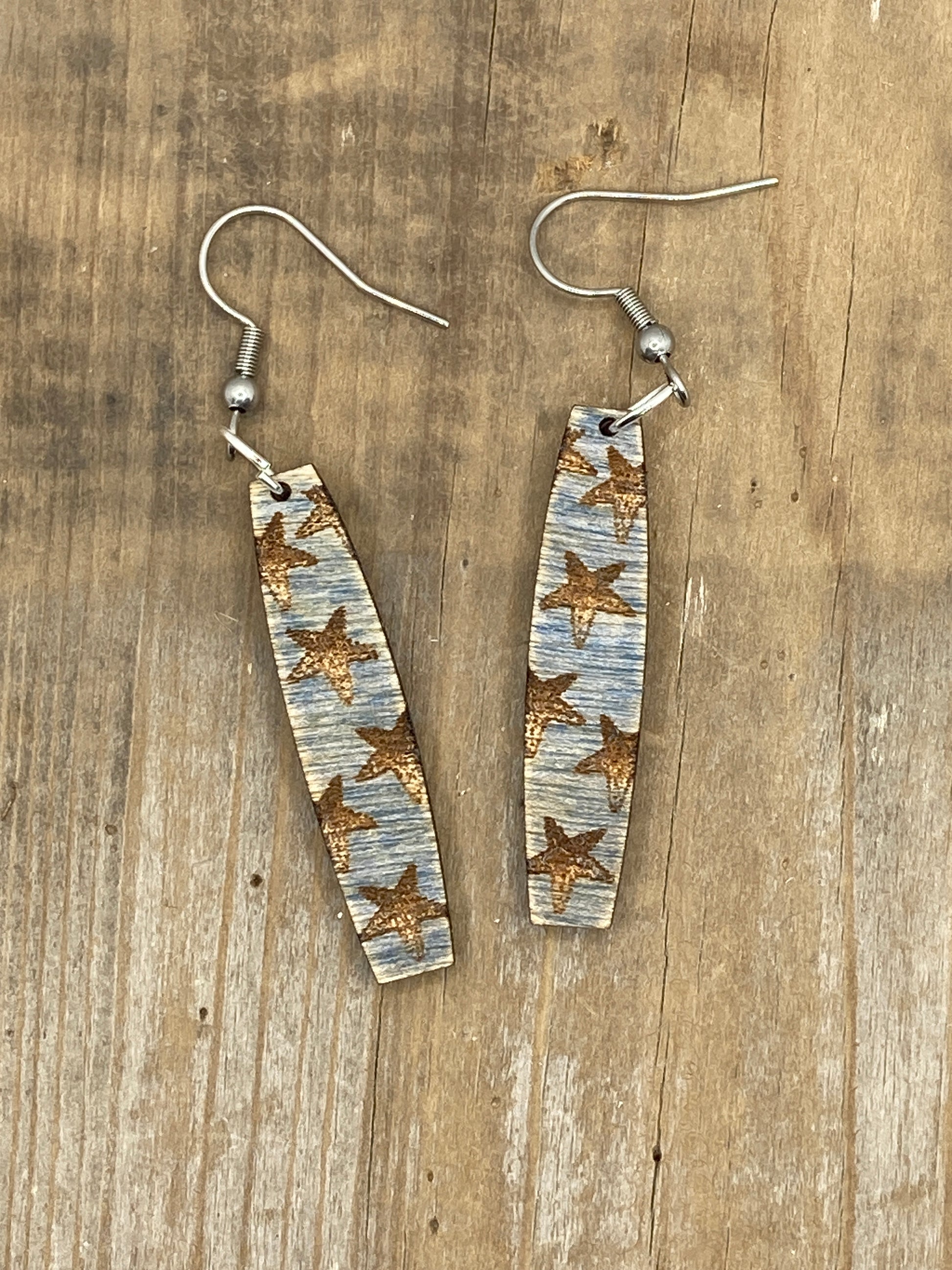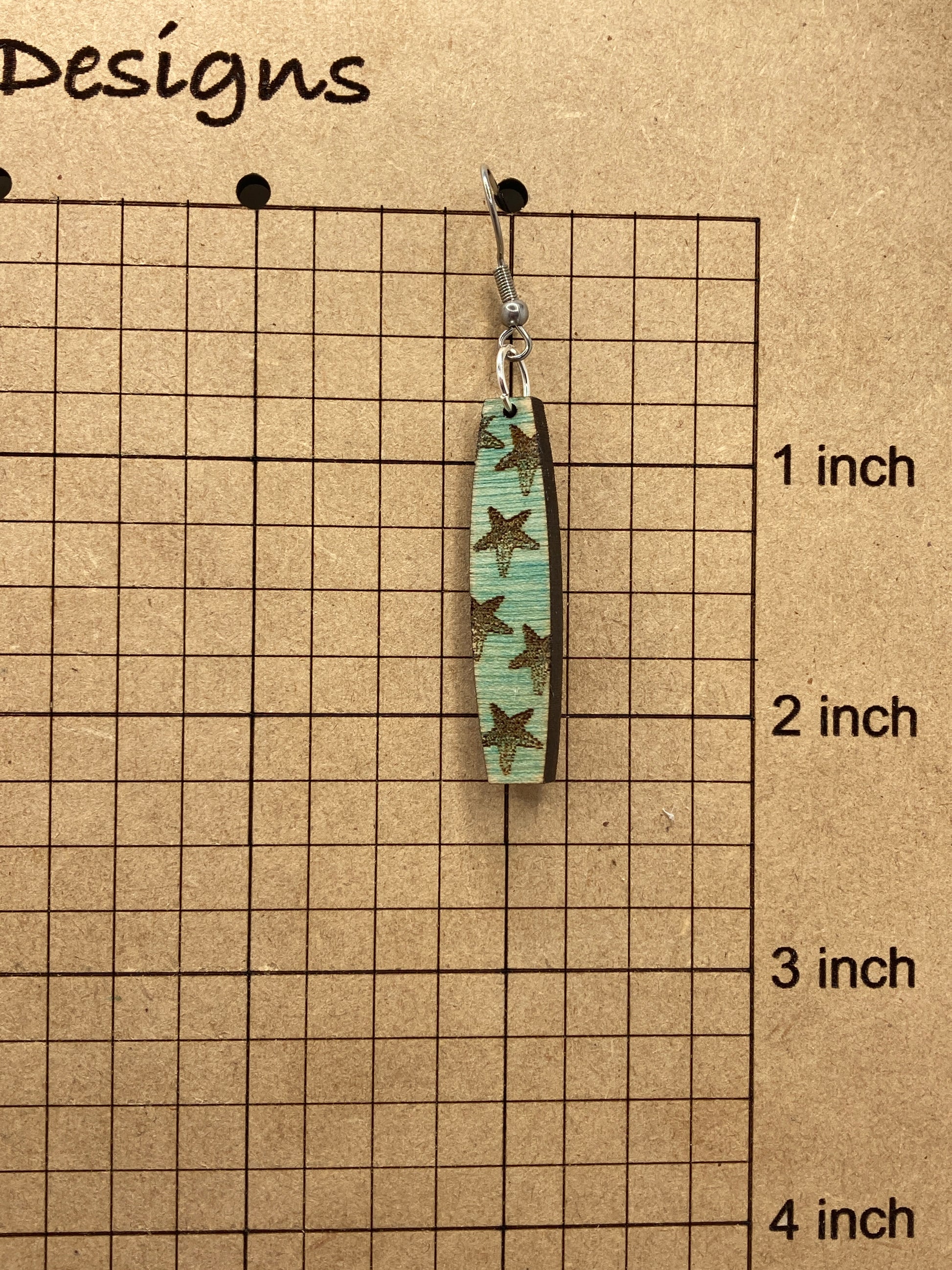 Hand-painted, laser-cut, wooden starfish bar dangle earrings.