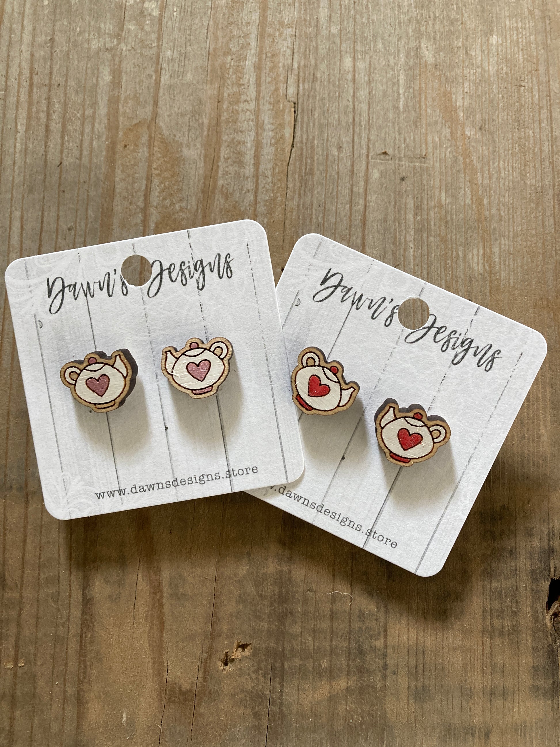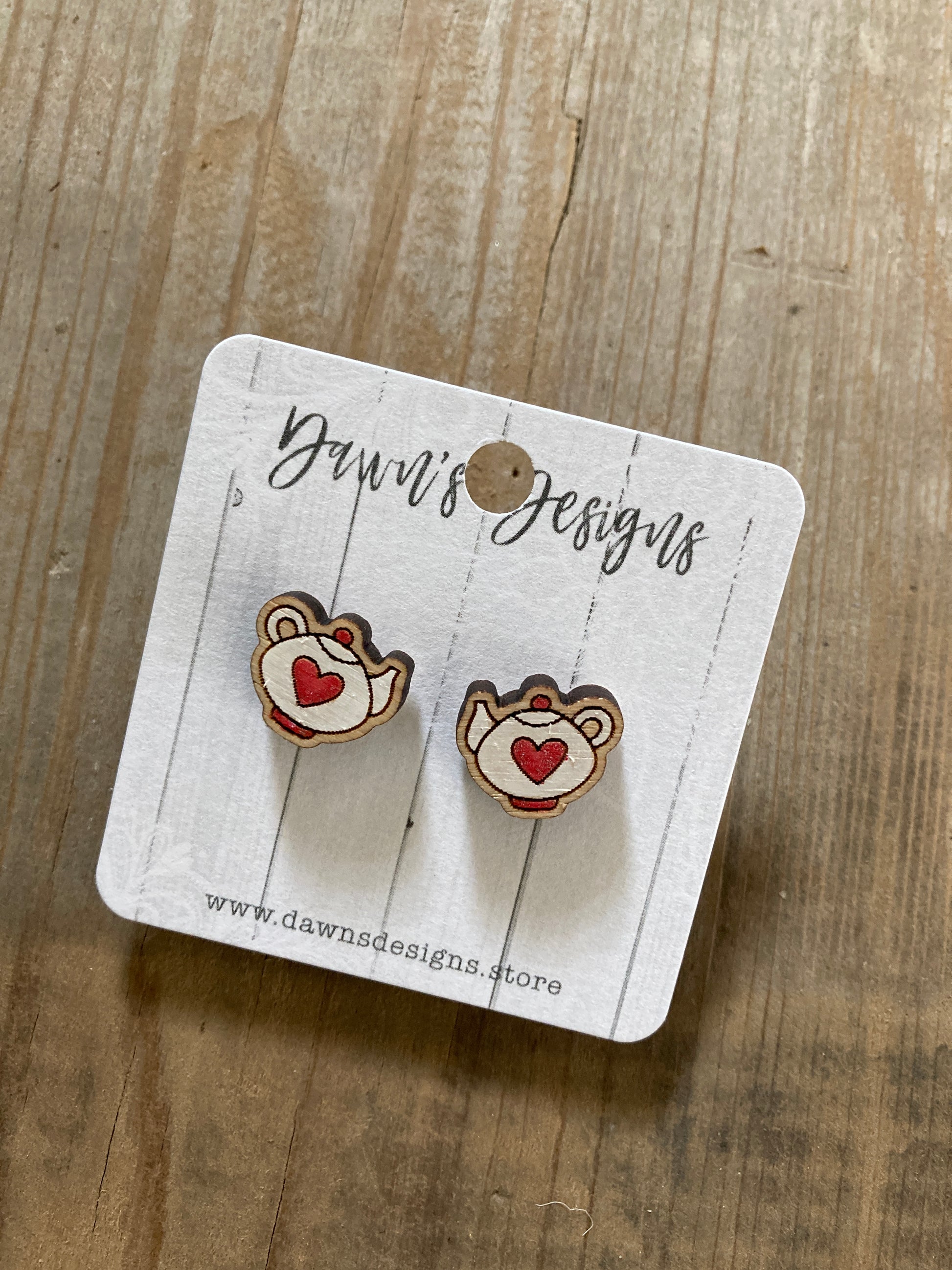 Hand-painted, laser-cut, wooden Teapot stud earrings. Approx. ½”