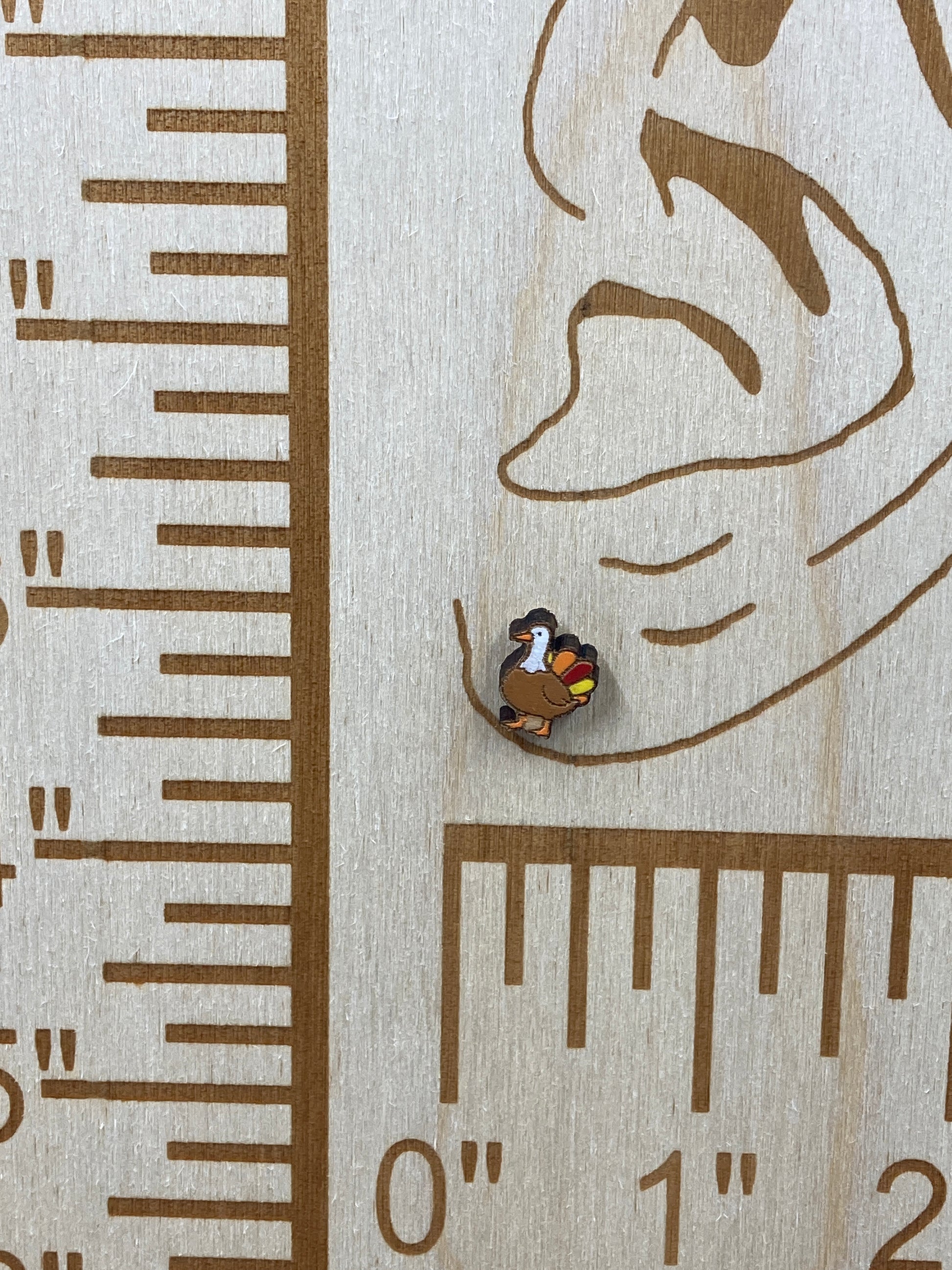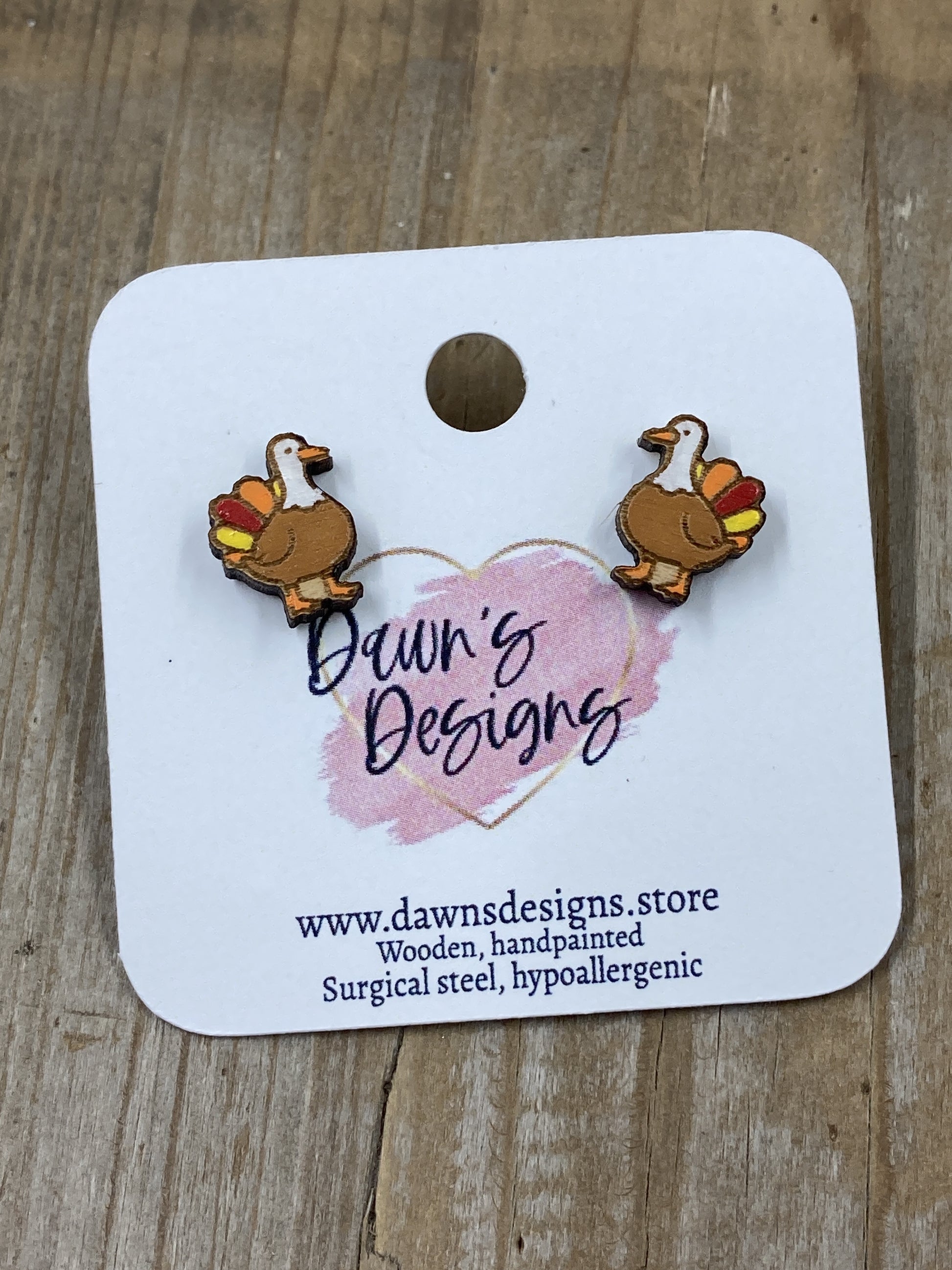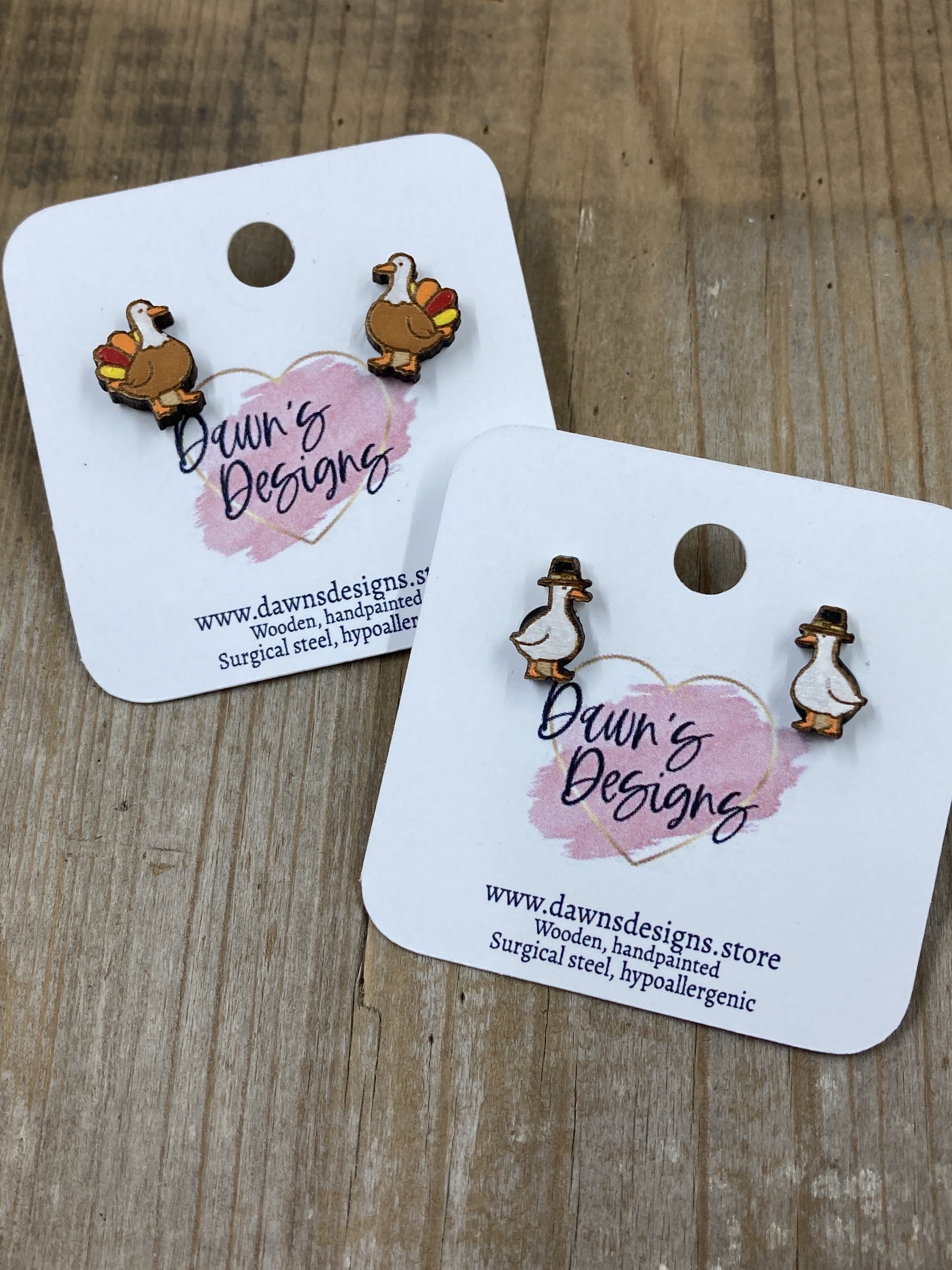 Hand-painted, laser-cut, wooden Thanksgiving goose stud earrings. Approx. ½”
