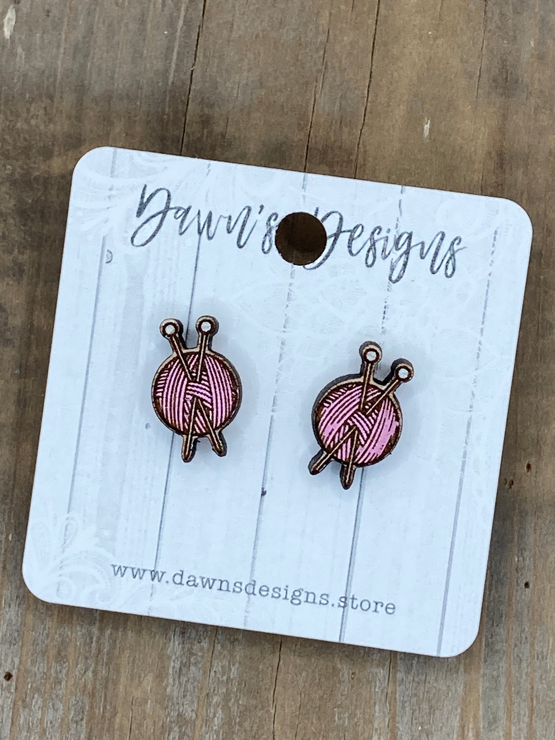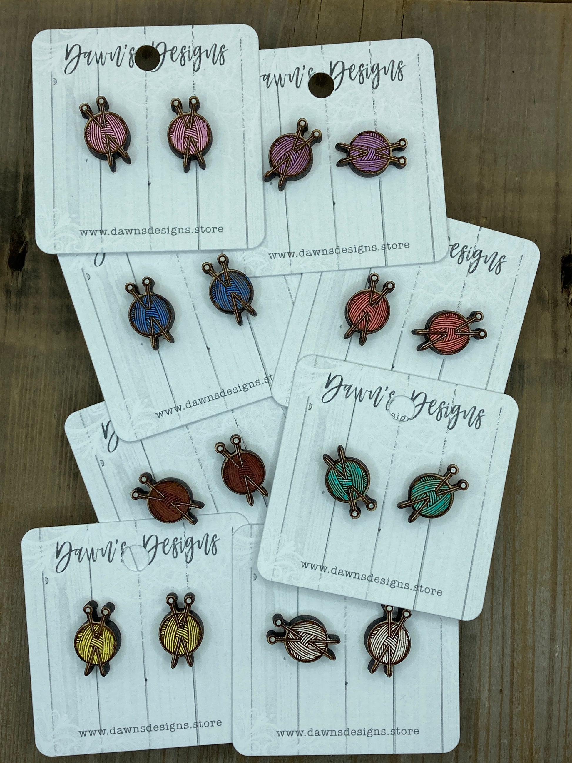Hand-painted, laser-cut, wooden Yarn and Needles stud earrings. Approx. ½”